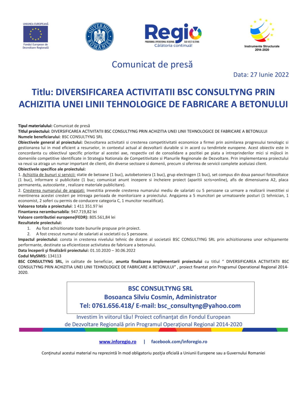 BSC CONSULTYNG SRL, in calitate de beneficiar, anunta finalizarea implementarii proiectului cu titlul “ DIVERSIFICAREA ACTIVITATII BSC CONSULTYNG PRIN ACHIZITIA UNEI LINII TEHNOLOGICE DE FABRICARE A BETONULUI” , proiect finantat prin Programul Operational Regional 2014-2020.