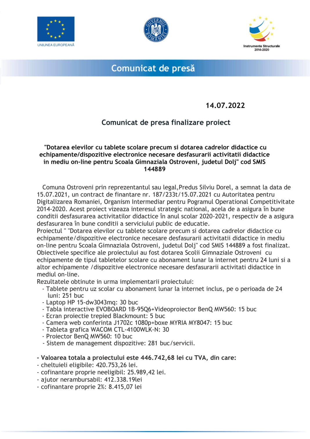 Proiectul „Dotarea elevilor cu tablete scolare precum si dotarea cadrelor didactice cu echipamente/dispozitive electronice necesare desfasurarii activitatii didactice in mediu on-line pentru Scoala Gimnaziala Ostroveni, judetul Dolj” cod SMIS 144889 a fost finalizat.