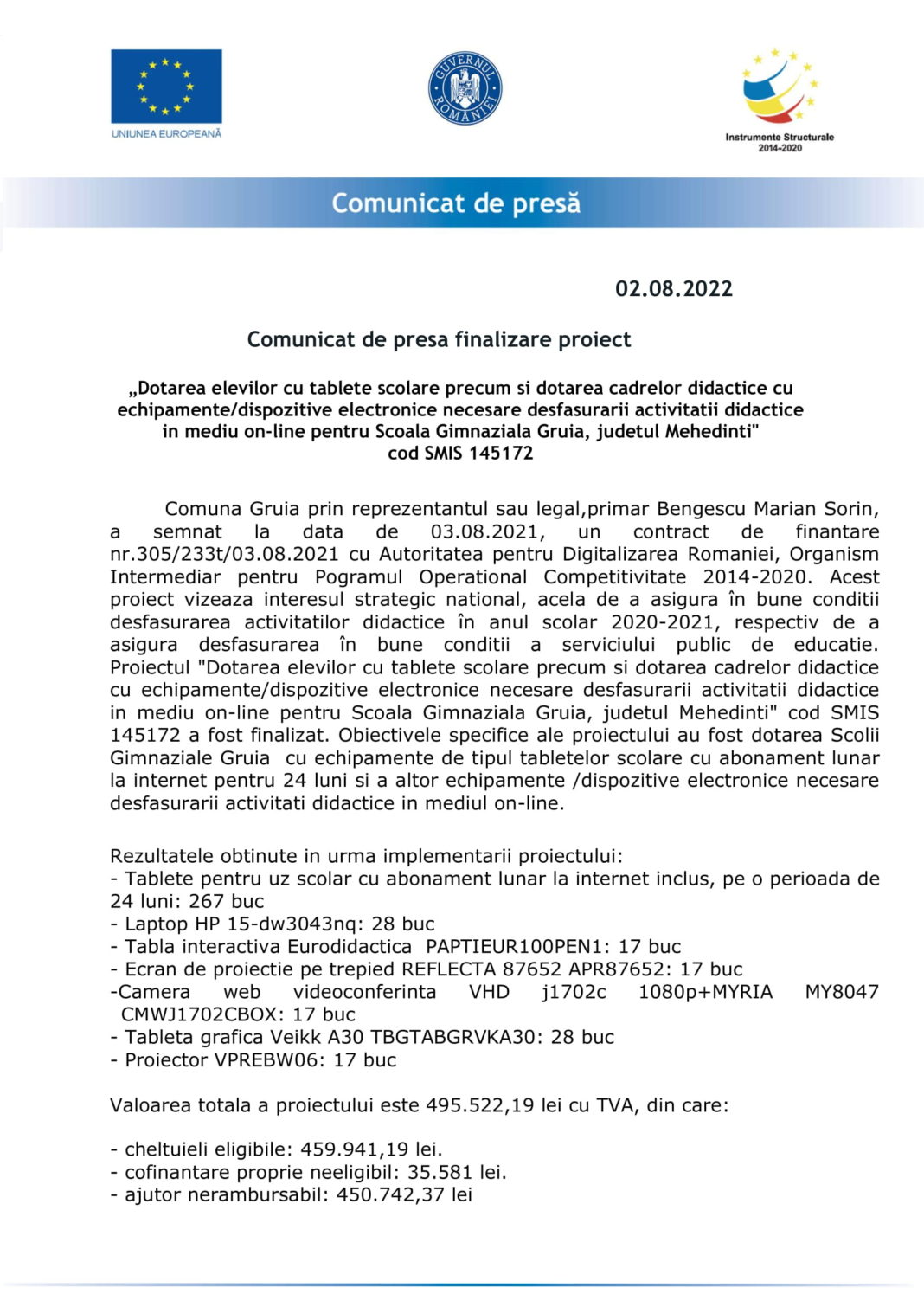 Proiectul „Dotarea elevilor cu tablete scolare precum si dotarea cadrelor didactice cu echipamente/dispozitive electronice necesare desfasurarii activitatii didactice in mediu on-line pentru Scoala Gimnaziala Gruia, judetul Mehedinti” cod SMIS