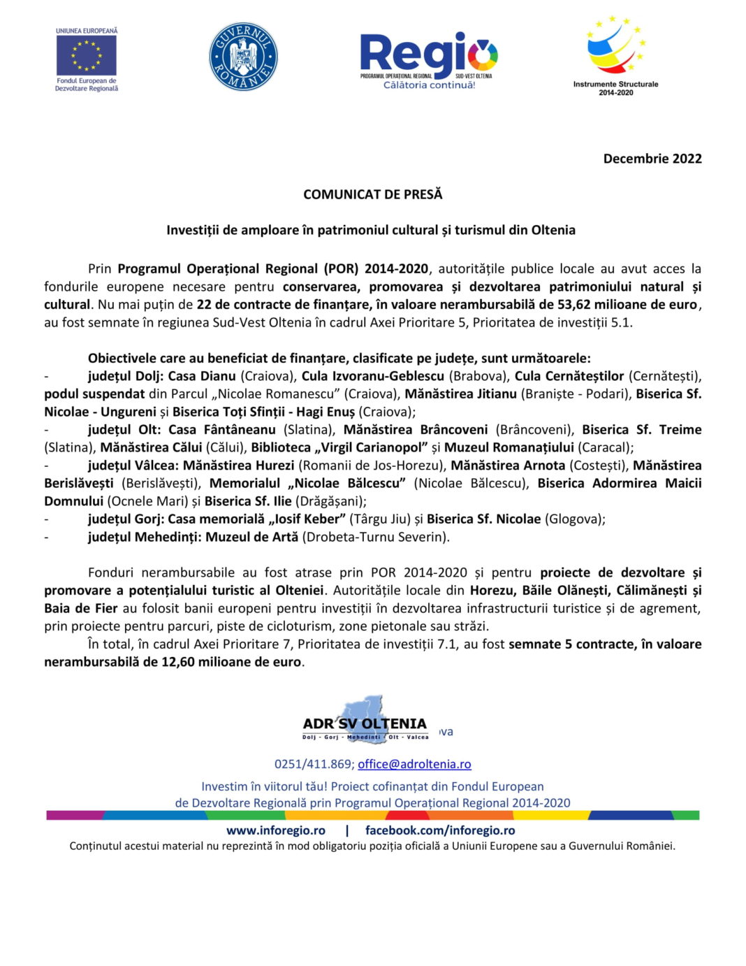 Prin Programul Operațional Regional (POR) 2014-2020, autoritățile publice locale au avut acces la fondurile europene necesare pentru conservarea, promovarea și dezvoltarea patrimoniului natural și cultural. Nu mai puțin de 22 de contracte de finanțare, în valoare nerambursabilă de 53,62 milioane de euro, au fost semnate în regiunea Sud-Vest Oltenia în cadrul Axei Prioritare 5, Prioritatea de investiții 5.1.
