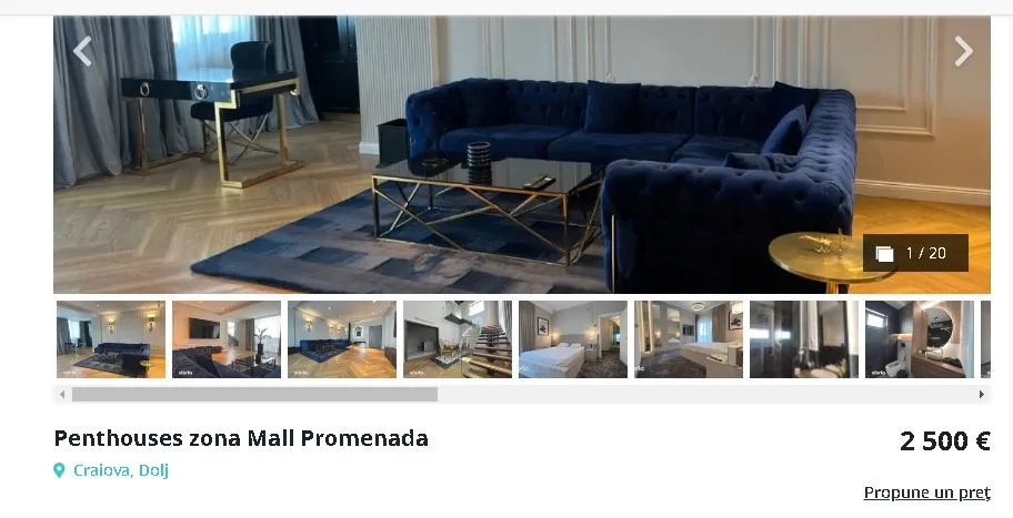 Dacă preţul mediu din Craiova pentru închirierea unui apartament este de 430 de euro pentru un apartament de trei camere, cine preferă să locuiască în condiţii de lux – şi este şi dispus să plătească generos pentru asta – are la dispoziţie o ofertă care îţi taie răsuflarea. Un penthouse pe două nivele, de 345 mp, dintre care 117 sunt alocaţi terasei, cu piscină încălzită. Apartamentul este situat în apropiere de Promenada, după cum se menţionează încă din titlul anunţului, zona devenită peste noapte punctul fierbinte al oraşului. Costul este de 2500 de euro lunar, adică peste 80 de euro pe zi. Fără TVA.