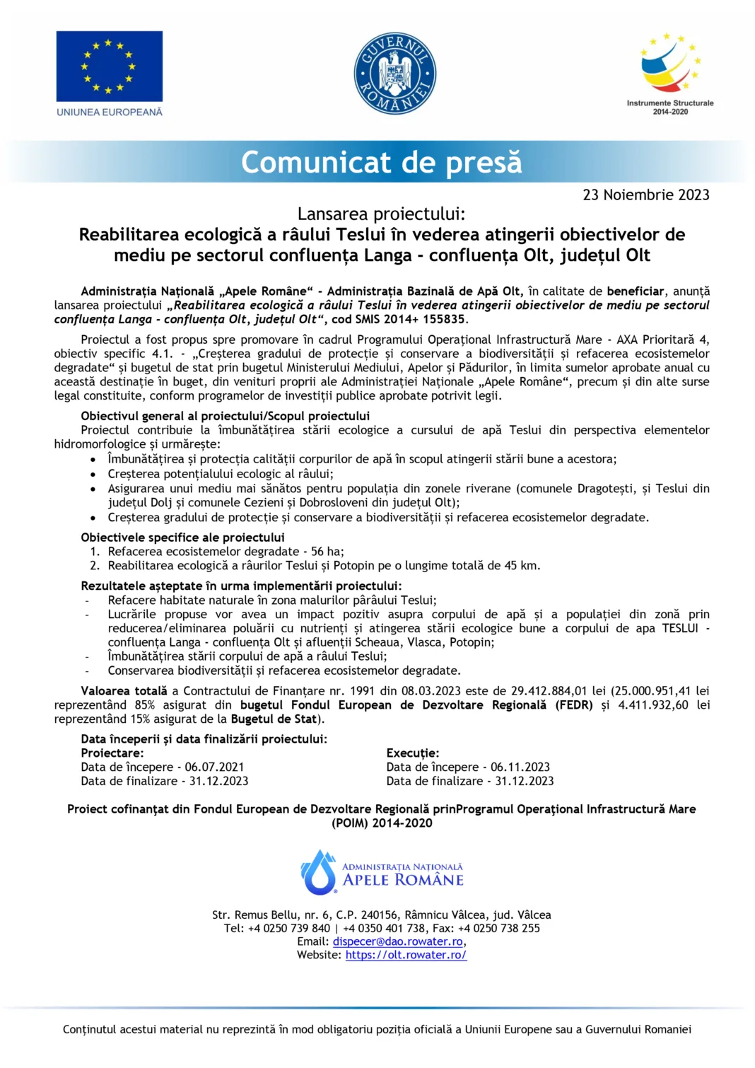 Administrația Națională „Apele Române“ – Administrația Bazinală de Apă Olt, în calitate de beneficiar, anunță lansarea proiectului „Reabilitarea ecologică a râului Teslui în vederea atingerii obiectivelor de mediu pe sectorul confluența Langa – confluența Olt, județul Olt“, cod SMIS 2014+ 155835.