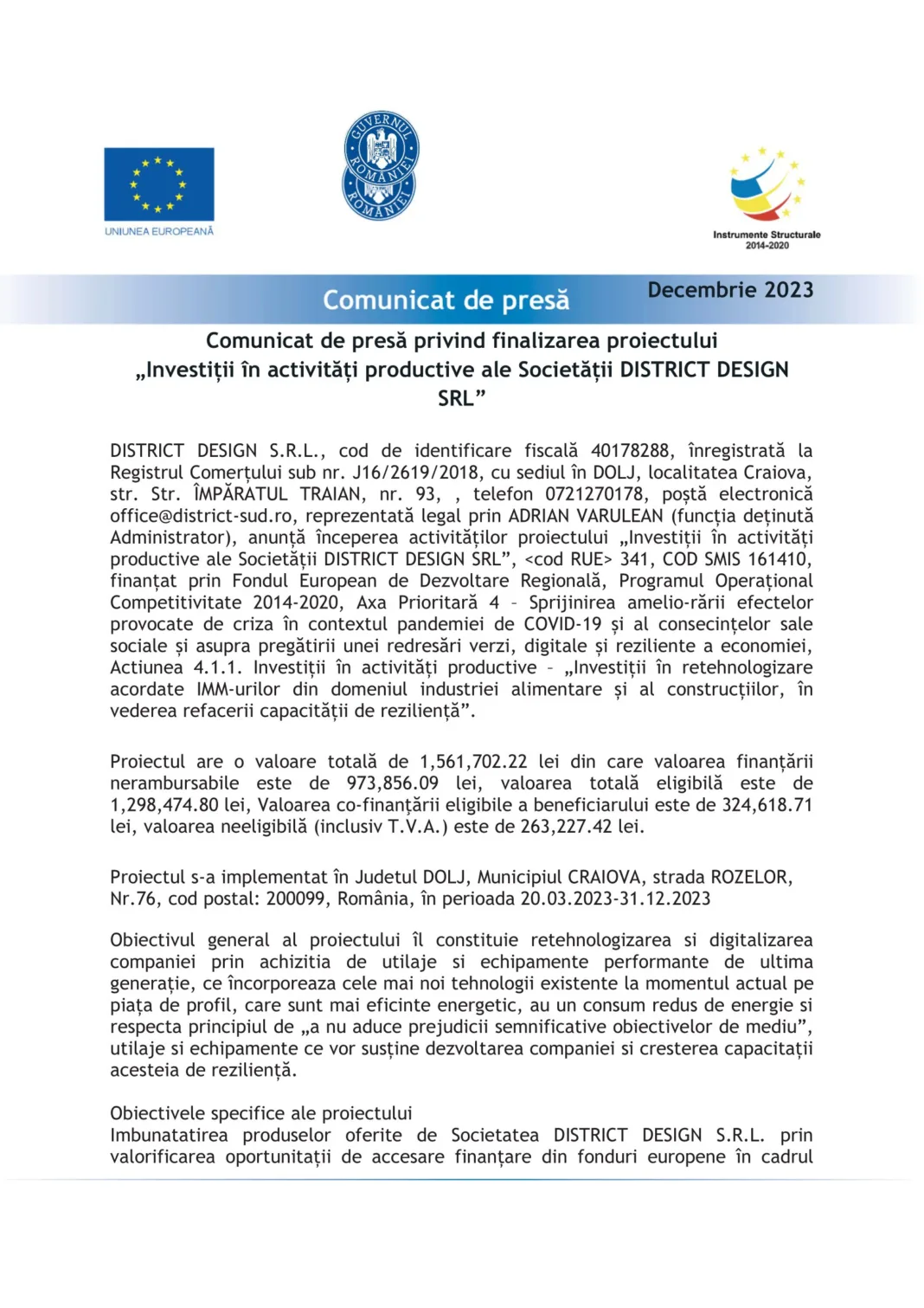 DISTRICT DESIGN S.R.L., cod de identificare fiscală 40178288, înregistrată la Registrul Comerțului sub nr. J16/2619/2018, cu sediul în DOLJ, localitatea Craiova, str. Str. ÎMPĂRATUL TRAIAN, nr. 93, , telefon 0721270178, poștă electronică [email protected], reprezentată legal prin ADRIAN VARULEAN (funcția deținută Administrator), anunță începerea activităților proiectului „Investiții în activități productive ale Societății DISTRICT DESIGN SRL”, <cod RUE> 341, COD SMIS 161410, finanțat prin Fondul European de Dezvoltare Regională, Programul Operațional Competitivitate 2014-2020, Axa Prioritară 4 – Sprijinirea amelio-rării efectelor provocate de criza în contextul pandemiei de COVID-19 și al consecințelor sale sociale și asupra pregătirii unei redresări verzi, digitale și reziliente a economiei, Actiunea 4.1.1. Investiții în activități productive – „Investiții în retehnologizare acordate IMM-urilor din domeniul industriei alimentare și al construcțiilor, în vederea refacerii capacității de reziliență”.