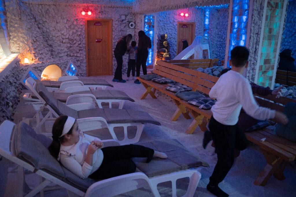 Departe de zgomotul orașului, cei care trec pragul salinei găses aici un minunat loc de relaxare. În timp ce micuții se joacă în locurile special amenajate pentru ei, adulții pot savura clipe de liniște, așezați pe băncuțele înșiruite pe lângă pereții de sare sau în șezlonguri. Încăperea este scăldată de o lumină difuză care străbate coloanele de sare de Himalaya, iar muzica susură în surdină.