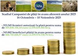 Agenția de Plăți și Intervenție pentru Agricultură (APIA) a autorizat la plată, în perioada 16 octombrie – 10 noiembrie 2025, în cadrul Campaniei de plăți în avans aferentă anului de cerere 2025, un număr de 553.545 fermieri, cu suma totală de 503.838.336,10 euro (2.559.619.384 lei).