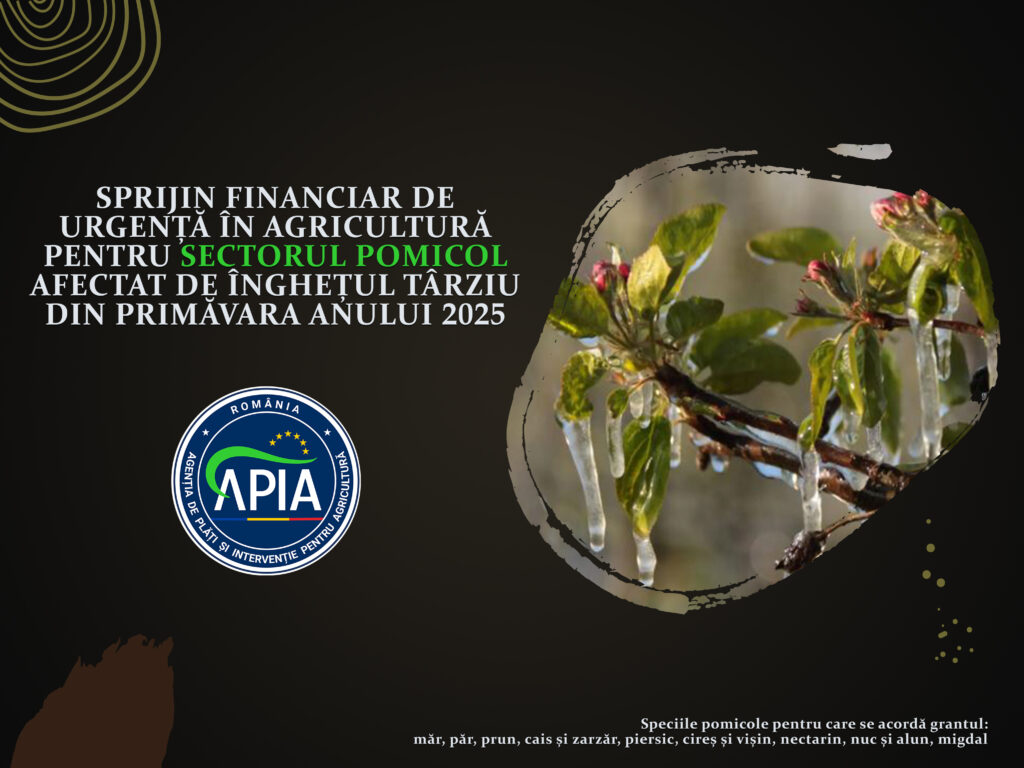 Vești importante pentru fermierii afectați de înghețul târziu din primăvara anului 2025. Agenția de Plăți și Intervenție pentru Agricultură (APIA) anunță că, până la data de 9 martie 2026 inclusiv, primește cereri pentru acordarea sprijinului financiar de urgență destinat sectorului pomicol.