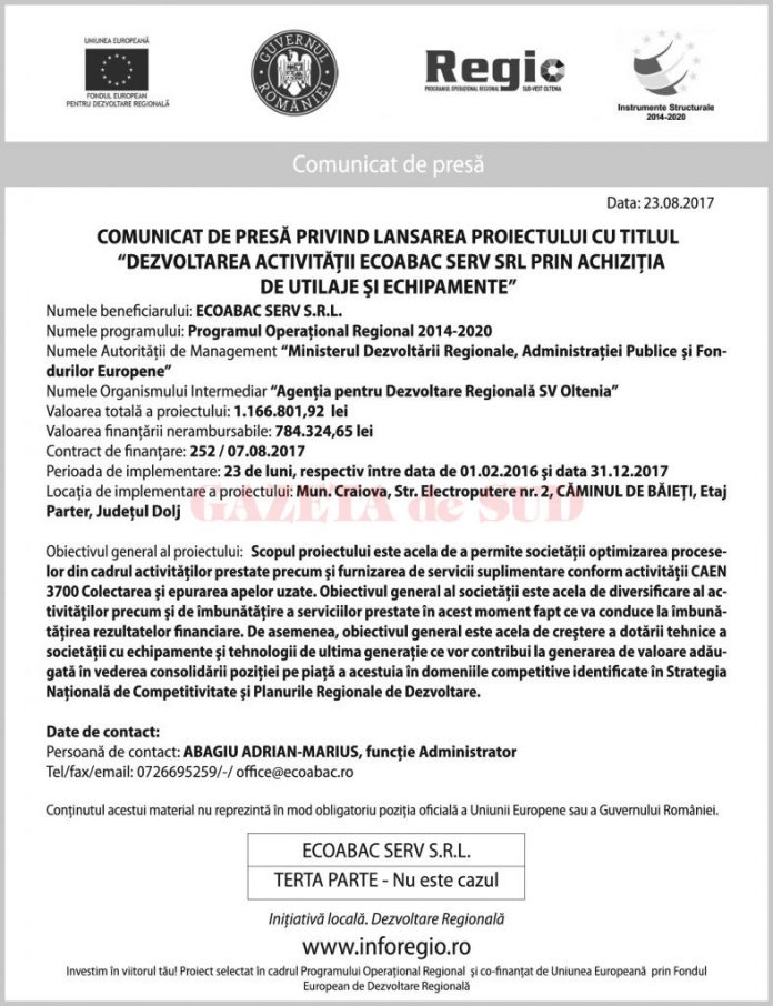 Comunicat de presă privind lansarea proiectului cu titlul „Dezvoltarea activităţii Ecobac Serv SRL prin achiziţia de utilaje şi echipamente”