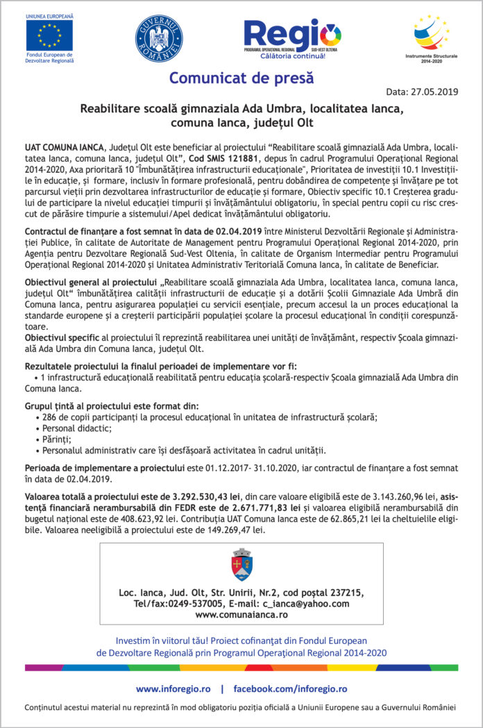Acasă Bani & Afaceri Publireportaj Comunicat de presă – Reabilitare scoală gimnazială Ada Umbra, localitatea Ianca, comuna...