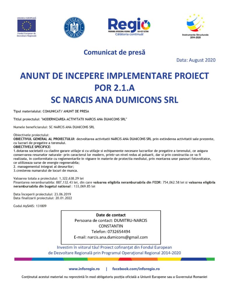 ANUNȚ DE ÎNCEPERE IMPLEMENTARE PROIECT POR 2.1.A SC NARCIS ANA DUMICONS SRL