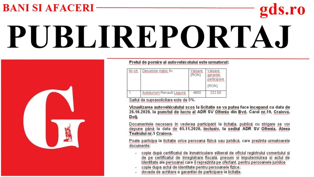 Licitaţia publică cu strigare va avea loc la sediul ADR SV Oltenia, Aleea Teatrului nr.1, în data de 11.11.2020, începând cu ora 10.00.