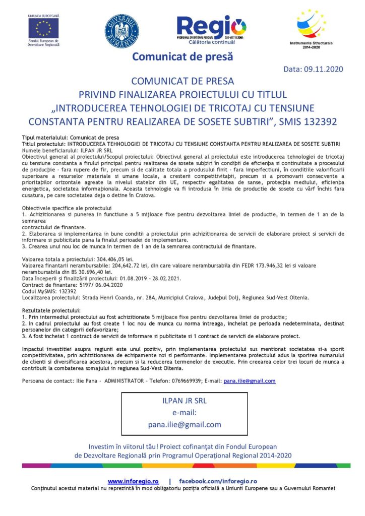 COMUNICAT DE PRESĂ PRIVIND FINALIZAREA PROIECTULUI CU TITLUL „INTRODUCEREA TEHNOLOGIEI DE TRICOTAJ CU TENSIUNE CONSTANTĂ PENTRU REALIZAREA DE ȘOSETE SUBȚIRI” , SMIS 132392