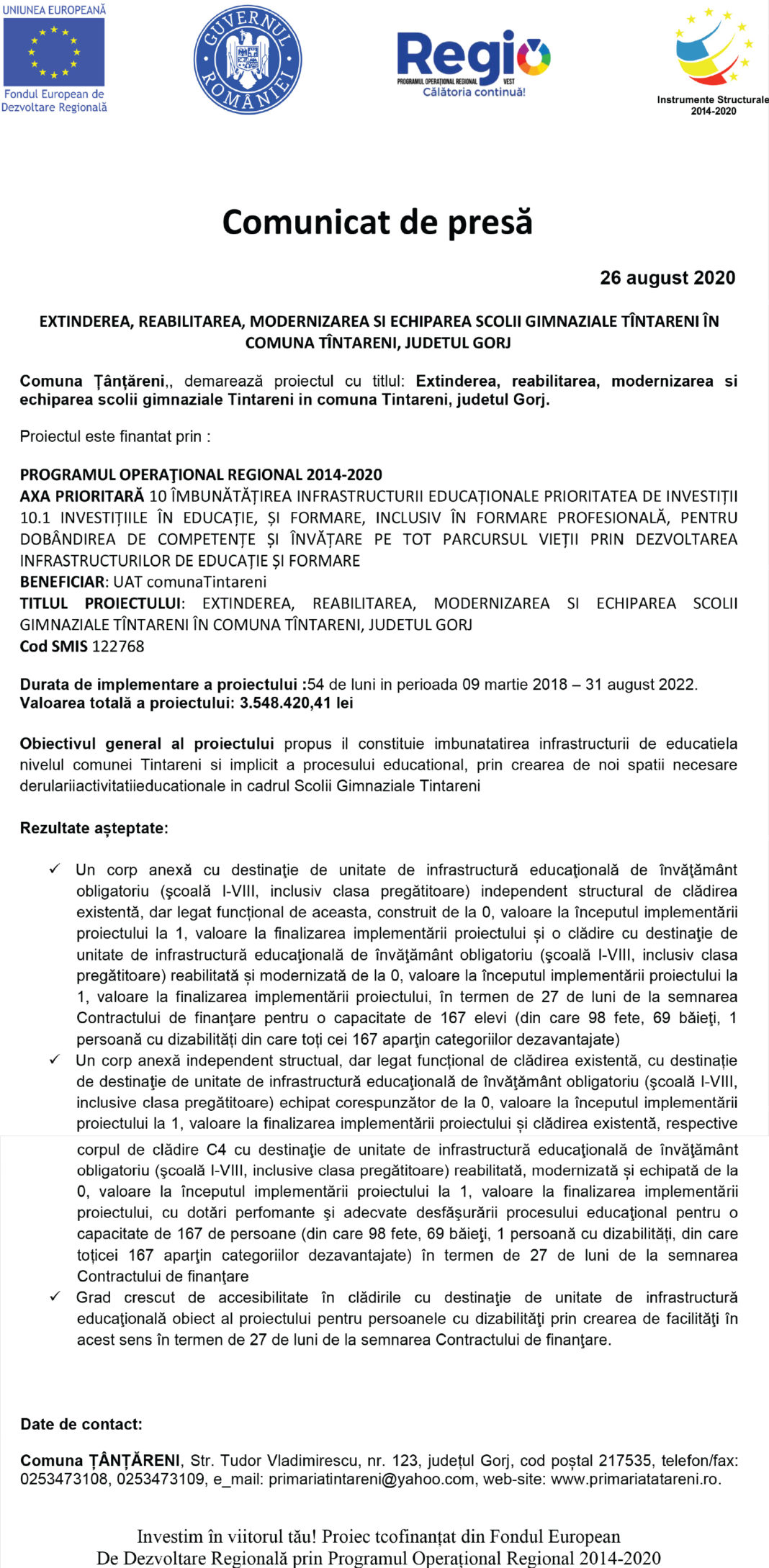 TITLUL PROIECTULUI: EXTINDEREA, REABILITAREA, MODERNIZAREA SI ECHIPAREA SCOLII GIMNAZIALE TÎNTARENI ÎN COMUNA TÎNTARENI, JUDETUL GORJ