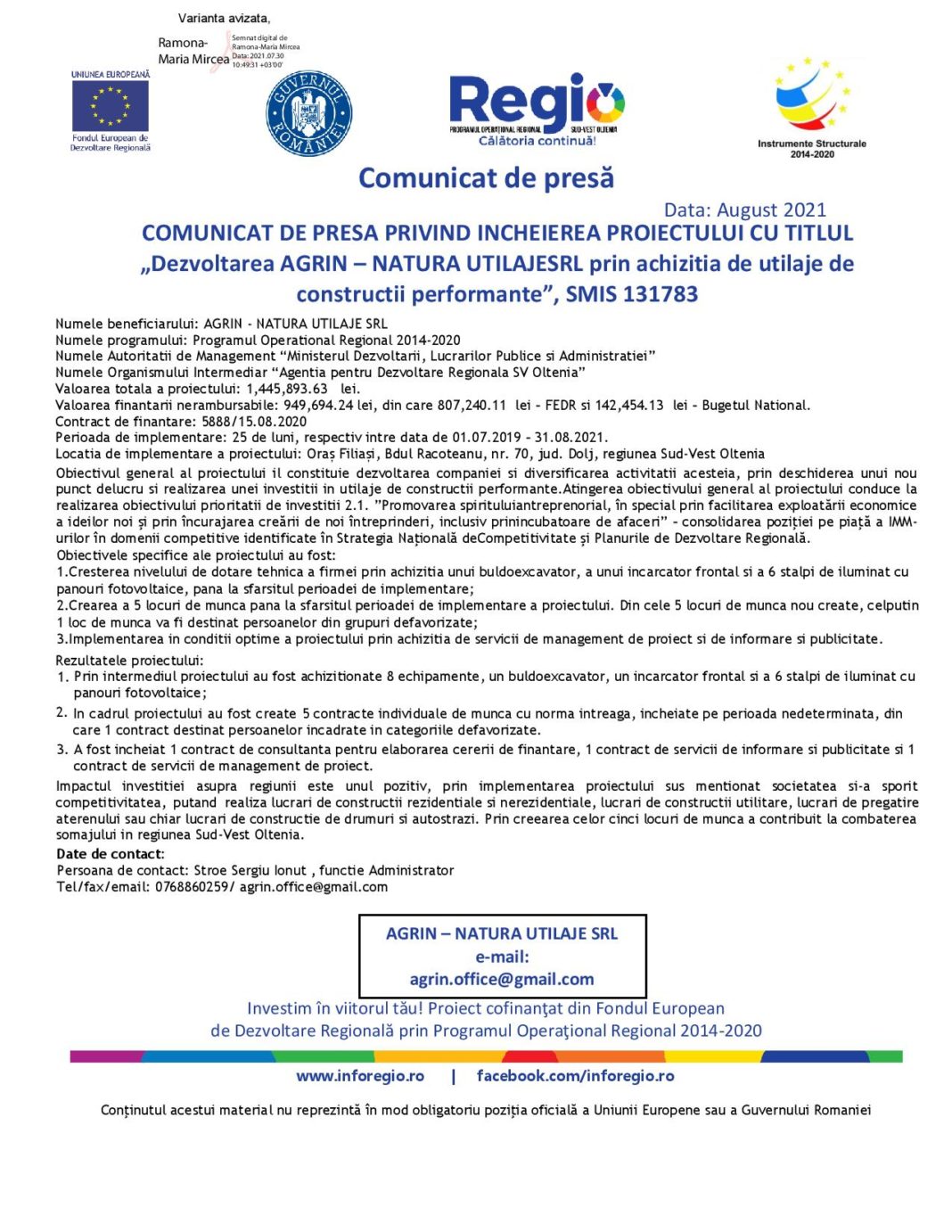 Numele beneficiarului: AGRIN – NATURA UTILAJE SRL