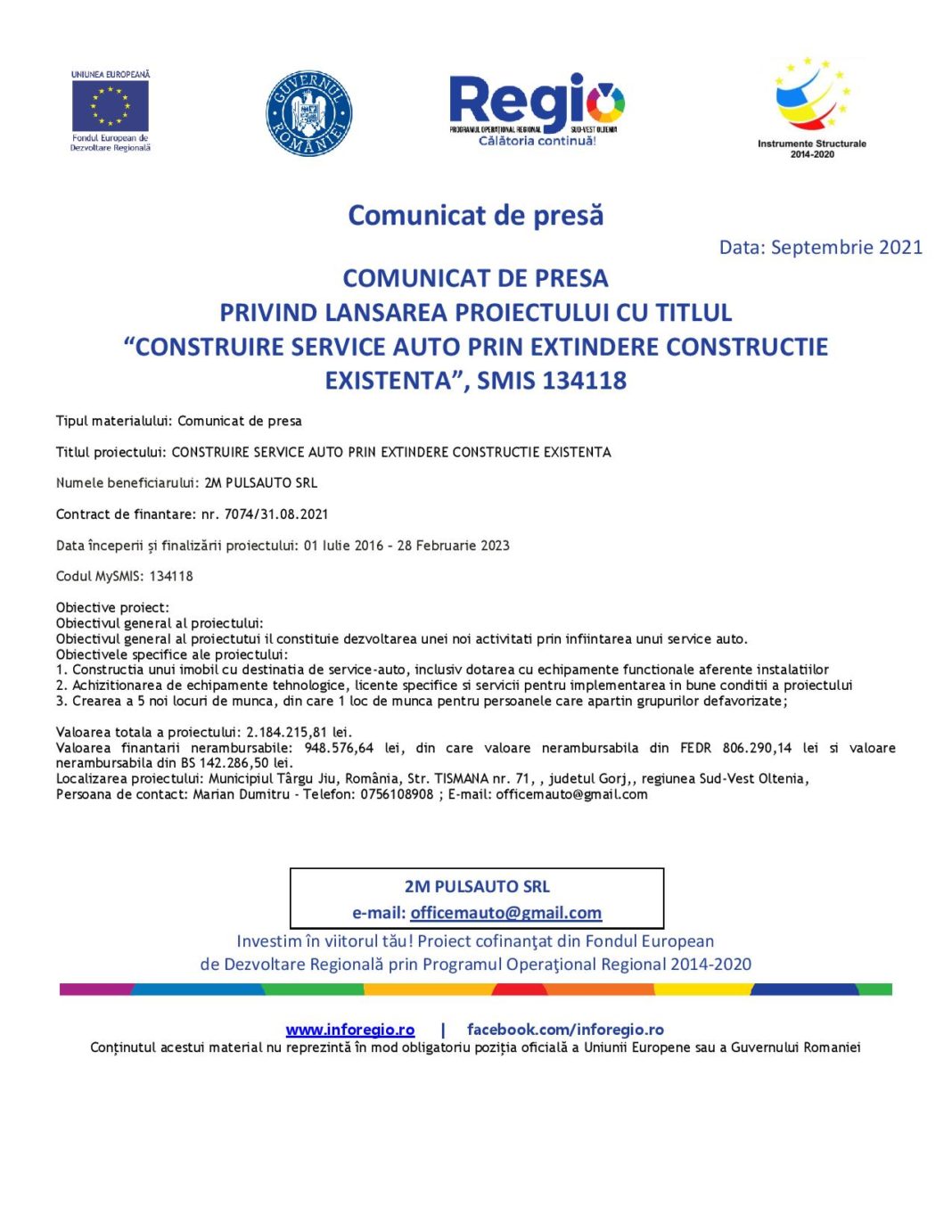 Titlul proiectului: CONSTRUIRE SERVICE AUTO PRIN EXTINDERE CONSTRUCTIE EXISTENTA