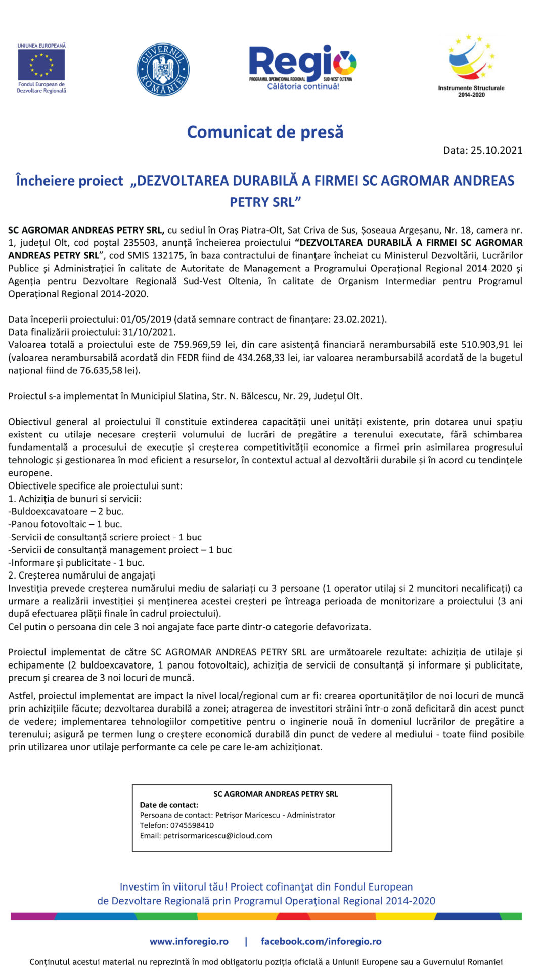 SC AGROMAR ANDREAS PETRY SRL, cu sediul în Oraș Piatra-Olt, Sat Criva de Sus, Șoseaua Argeșanu, Nr. 18, camera nr.1, județul Olt, cod poștal 235503, anunță încheierea proiectului “DEZVOLTAREA DURABILĂ A FIRMEI SC AGROMAR ANDREAS PETRY SRL”, cod SMIS 132175, în baza contractului de finanţare încheiat cu Ministerul Dezvoltării, Lucrărilor Publice și Administrației în calitate de Autoritate de Management a Programului Operațional Regional 2014-2020 şi Agenția pentru Dezvoltare Regională Sud-Vest Oltenia, în calitate de Organism Intermediar pentru Programul Operațional Regional 2014-2020.