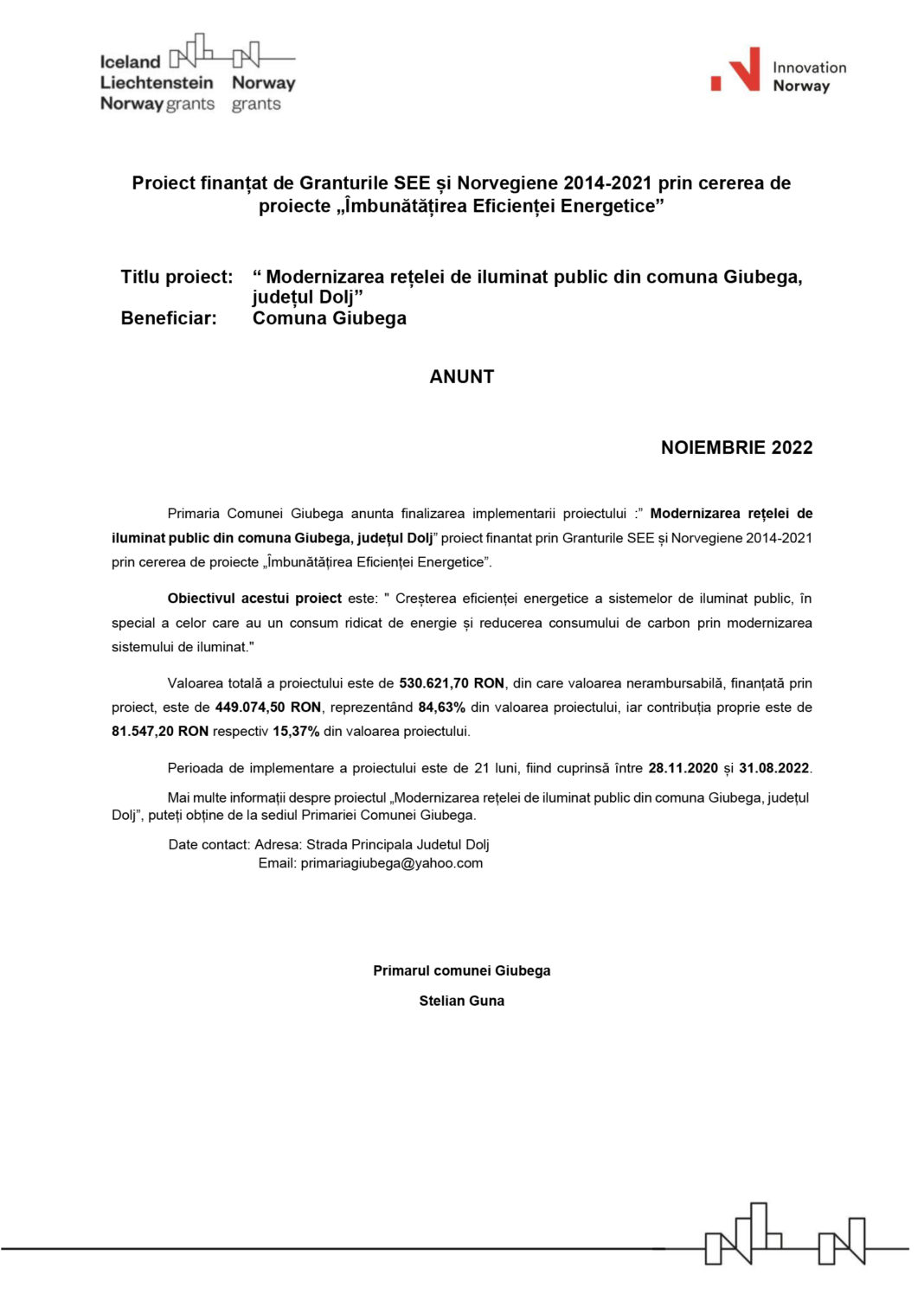 Primaria Comunei Giubega anunta finalizarea implementarii proiectului :” Modernizarea rețelei de iluminat public din comuna Giubega, județul Dolj” proiect finantat prin Granturile SEE și Norvegiene 2014-2021 prin cererea de proiecte „Îmbunătățirea Eficienței Energetice”.