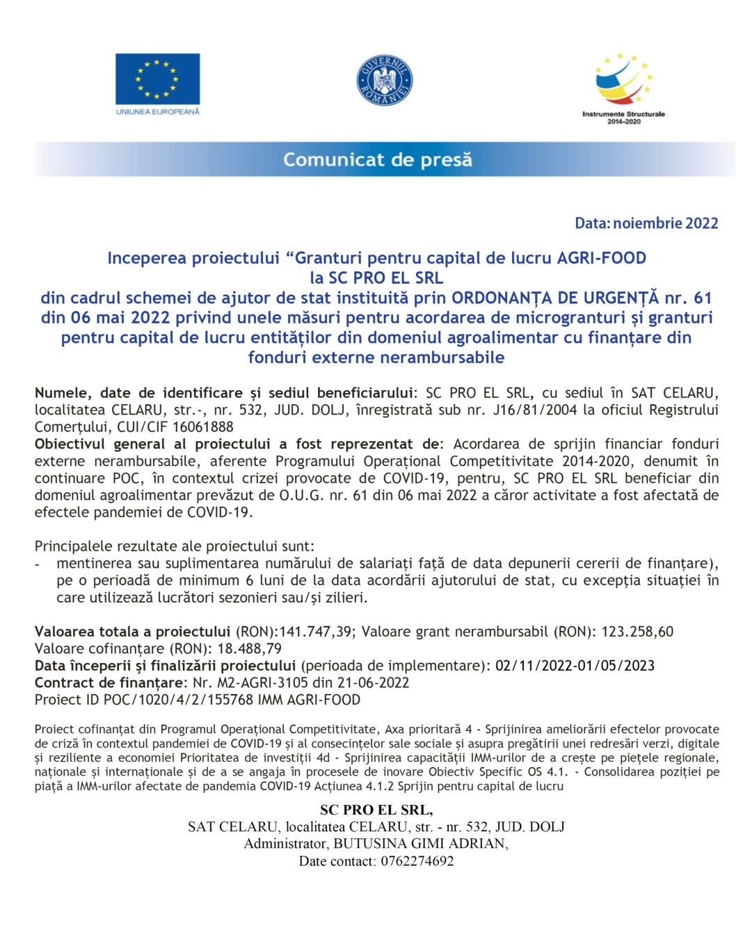 Începerea proiectului “Granturi pentru capital de lucru AGRI-FOOD la SC PRO EL SRL din cadrul schemei de ajutor de stat instituită prin ORDONANȚA DE URGENȚĂ nr. 61 din 06 mai 2022 privind unele măsuri pentru acordarea de microgranturi și granturi pentru capital de lucru entităților din domeniul agroalimentar cu finanțare din fonduri externe nerambursabile