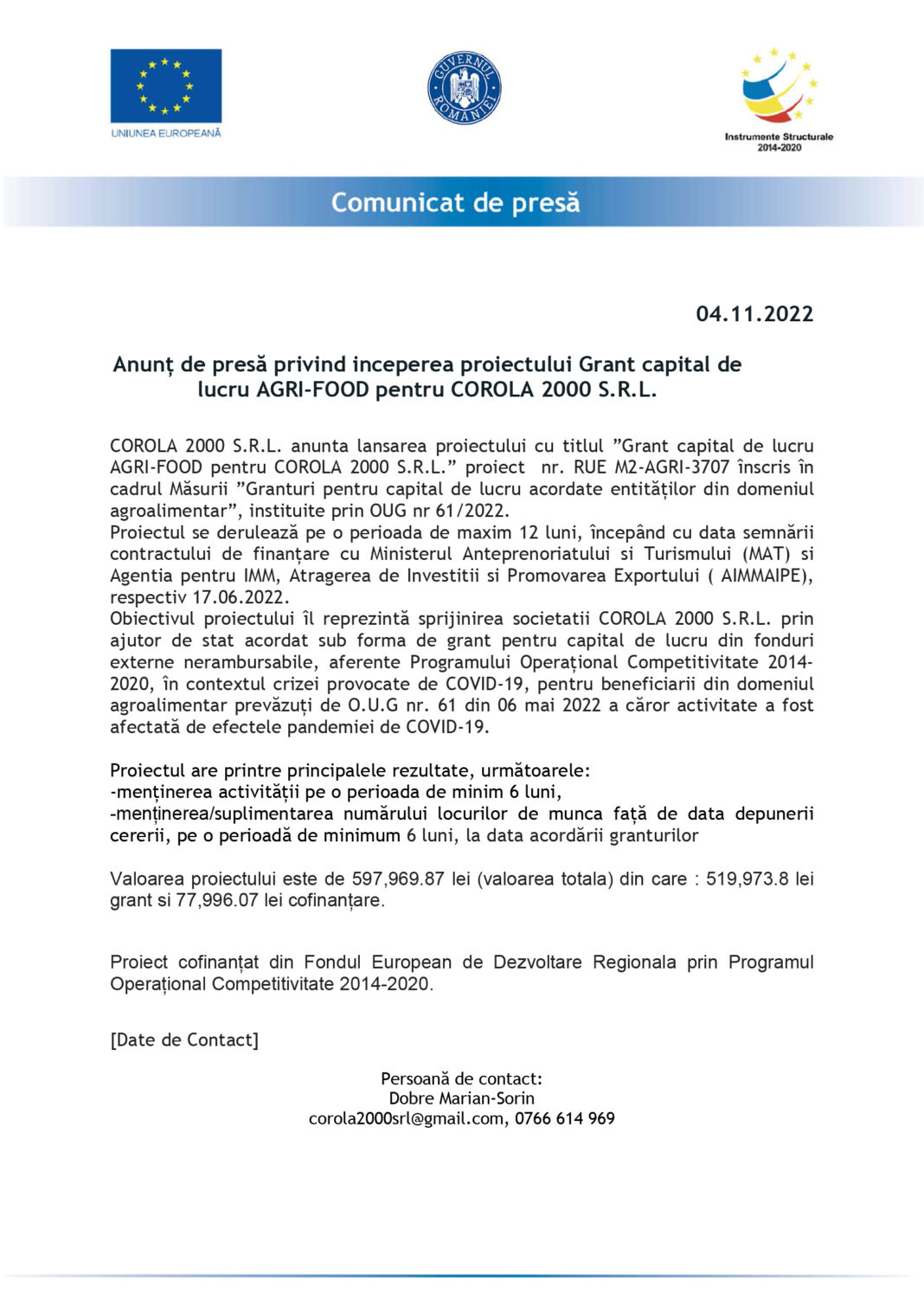 COROLA 2000 S.R.L. anunta lansarea proiectului cu titlul ”Grant capital de lucru AGRI-FOOD pentru COROLA 2000 S.R.L.” proiect nr. RUE M2-AGRI-3707 înscris în cadrul Măsurii ”Granturi pentru capital de lucru acordate entităților din domeniul agroalimentar”, instituite prin OUG nr 61/2022.