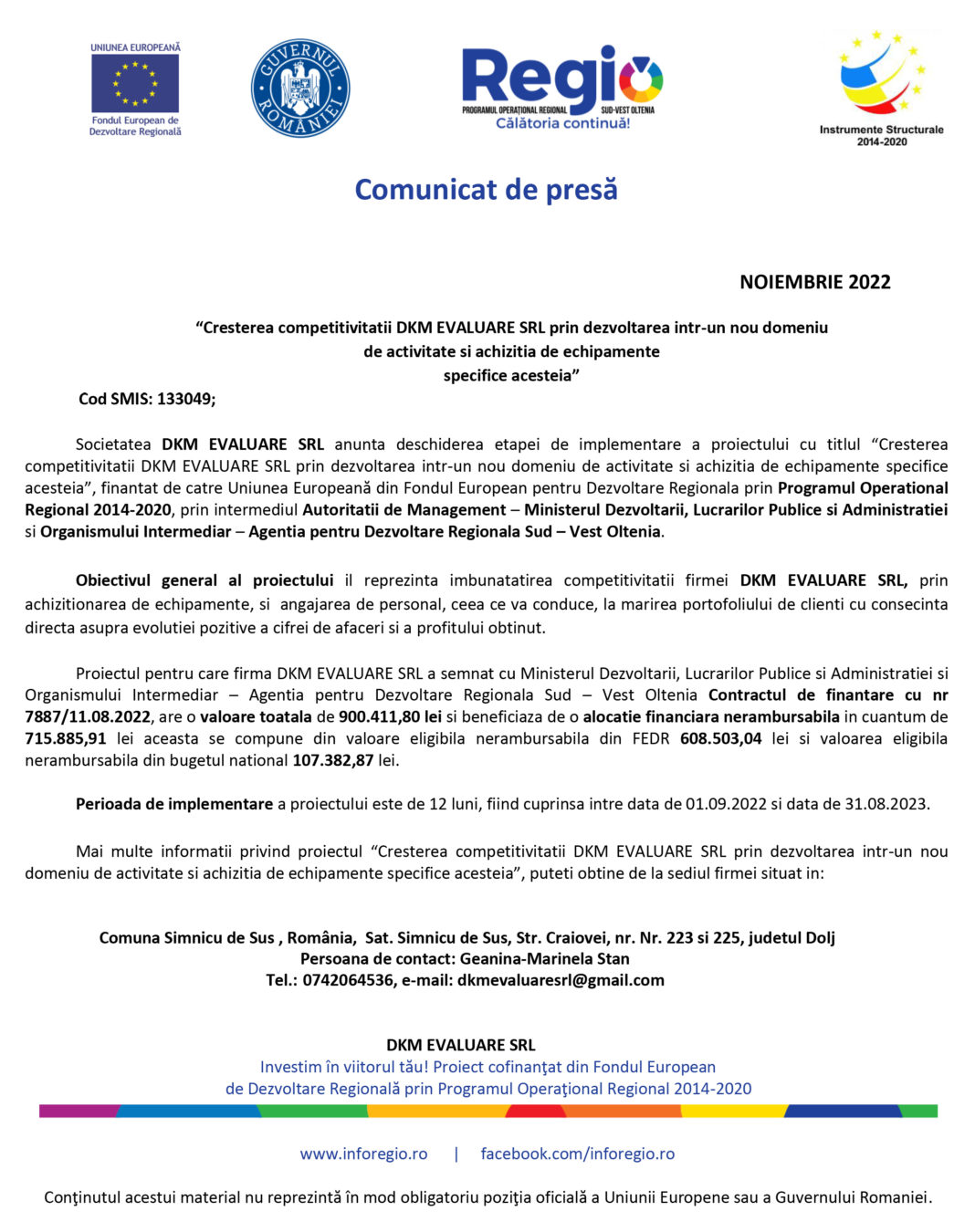 Proiectul pentru care firma DKM EVALUARE SRL a semnat cu Ministerul Dezvoltarii, Lucrarilor Publice si Administratiei si Organismului Intermediar – Agentia pentru Dezvoltare Regionala Sud – Vest Oltenia Contractul de finantare cu nr 7887/11.08.2022, are o valoare toatala de 900.411,80 lei si beneficiaza de o alocatie financiara nerambursabila in cuantum de 715.885,91 lei aceasta se compune din valoare eligibila nerambursabila din FEDR 608.503,04 lei si valoarea eligibila nerambursabila din bugetul national 107.382,87 lei.