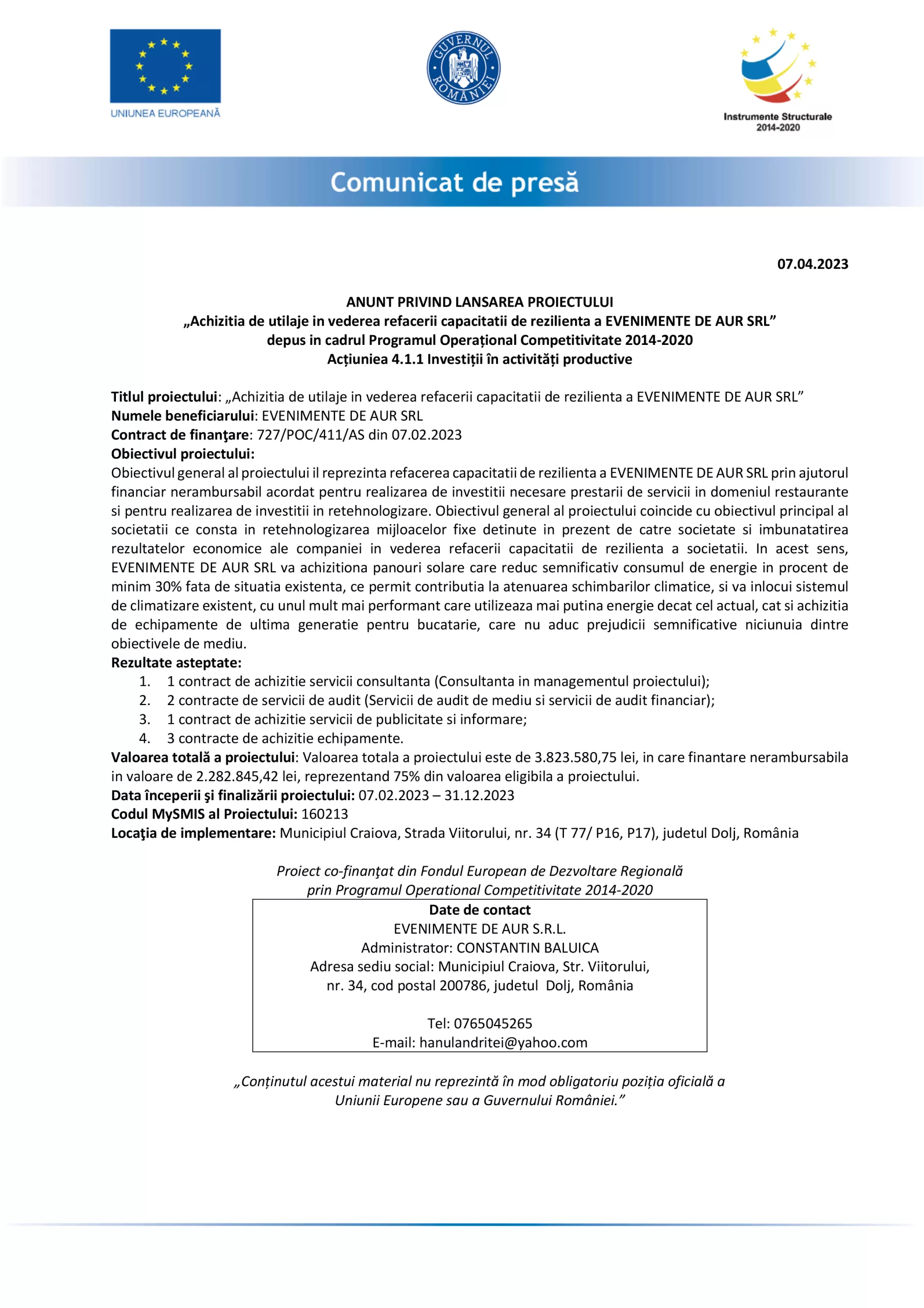 Data începerii şi finalizării proiectului: 07.02.2023 – 31.12.2023