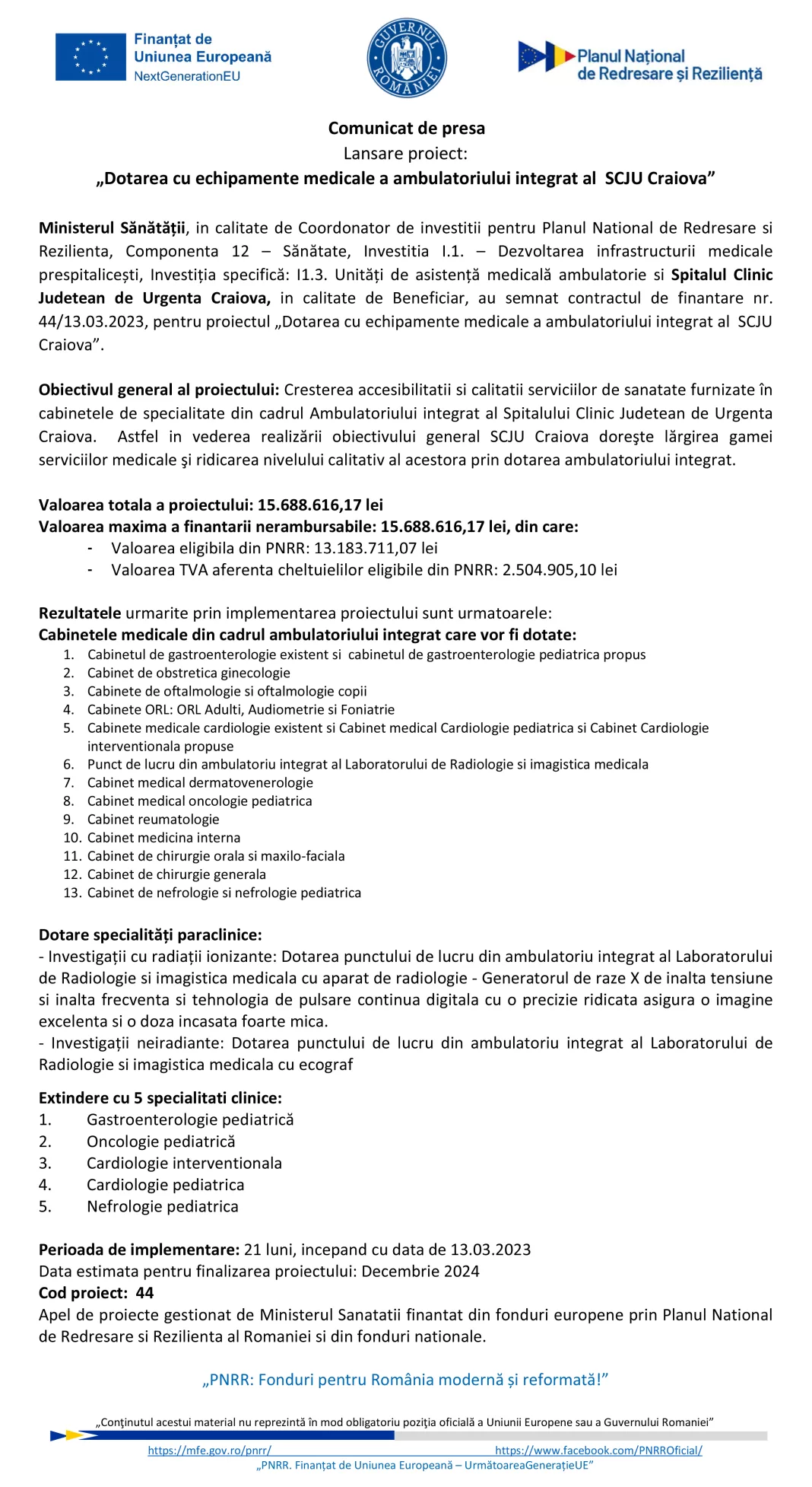 Ministerul Sănătății, in calitate de Coordonator de investitii pentru Planul National de Redresare si Rezilienta, Componenta 12 – Sănătate, Investitia I.1. – Dezvoltarea infrastructurii medicale prespitalicești, Investiția specifică: I1.3. Unități de asistență medicală ambulatorie si Spitalul Clinic Judetean de Urgenta Craiova, in calitate de Beneficiar, au semnat contractul de finantare nr. 44/13.03.2023, pentru proiectul „Dotarea cu echipamente medicale a ambulatoriului integrat al SCJU Craiova”.
