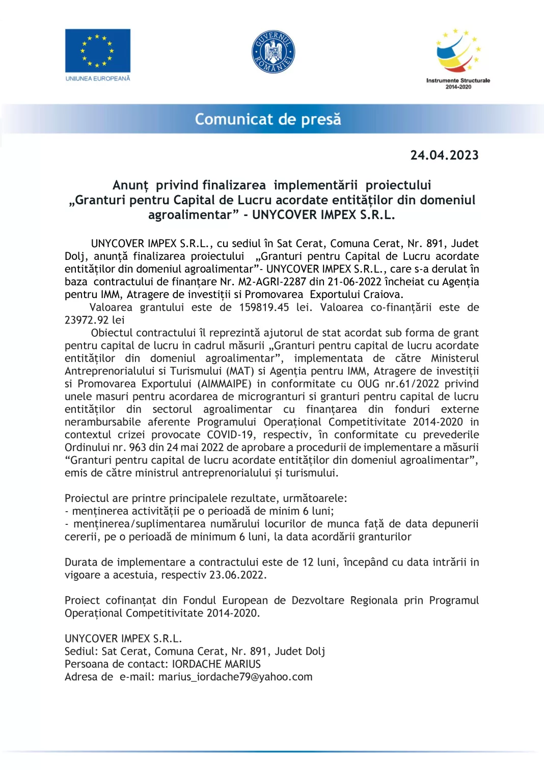 UNYCOVER IMPEX S.R.L., cu sediul în Sat Cerat, Comuna Cerat, Nr. 891, Judet Dolj, anunță finalizarea proiectului „Granturi pentru Capital de Lucru acordate entităților din domeniul agroalimentar”- UNYCOVER IMPEX S.R.L., care s-a derulat în baza contractului de finanțare Nr. M2-AGRI-2287 din 21-06-2022 încheiat cu Agenția pentru IMM, Atragere de investiții si Promovarea Exportului Craiova.