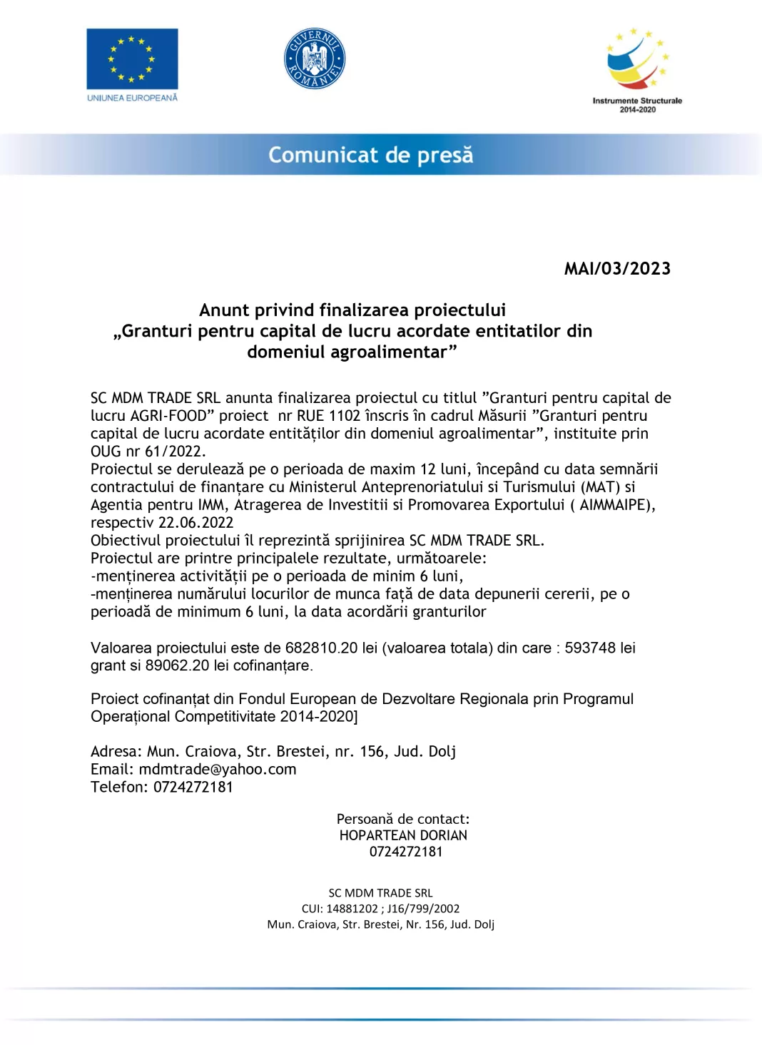 SC MDM TRADE SRL anunta finalizarea proiectul cu titlul ”Granturi pentru capital de lucru AGRI-FOOD” proiect nr RUE 1102 înscris în cadrul Măsurii ”Granturi pentru capital de lucru acordate entităților din domeniul agroalimentar”, instituite prin OUG nr 61/2022.