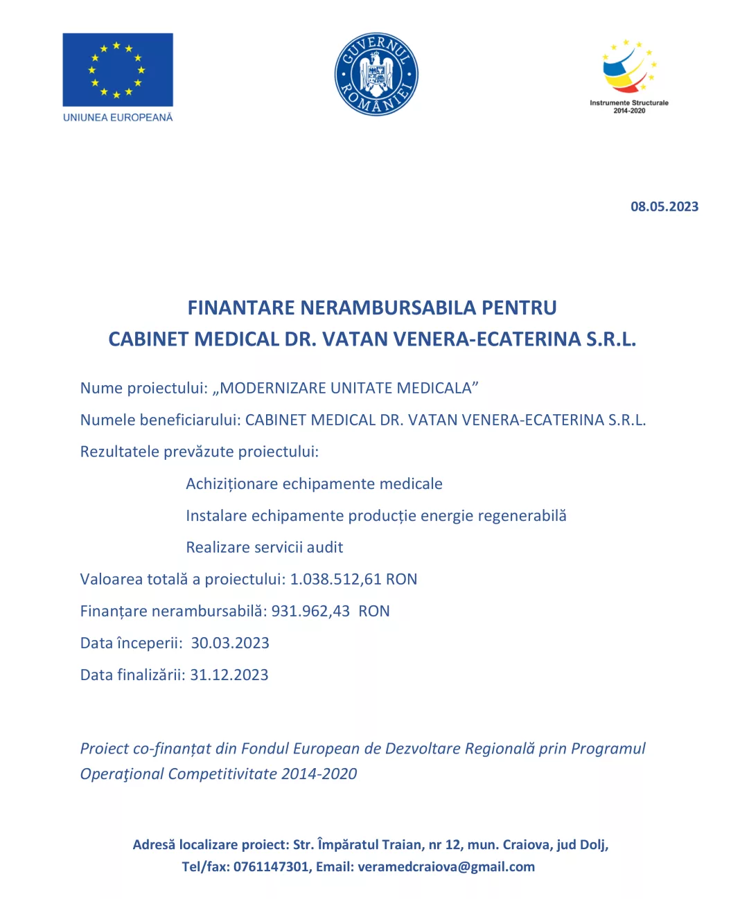 Nume proiectului: „MODERNIZARE UNITATE MEDICALA”