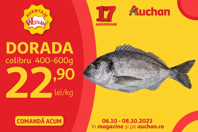 În perioada 06 – 08.10.2023, ai super preț la doradă calibru 400-600 g: 22,90 lei/kg.