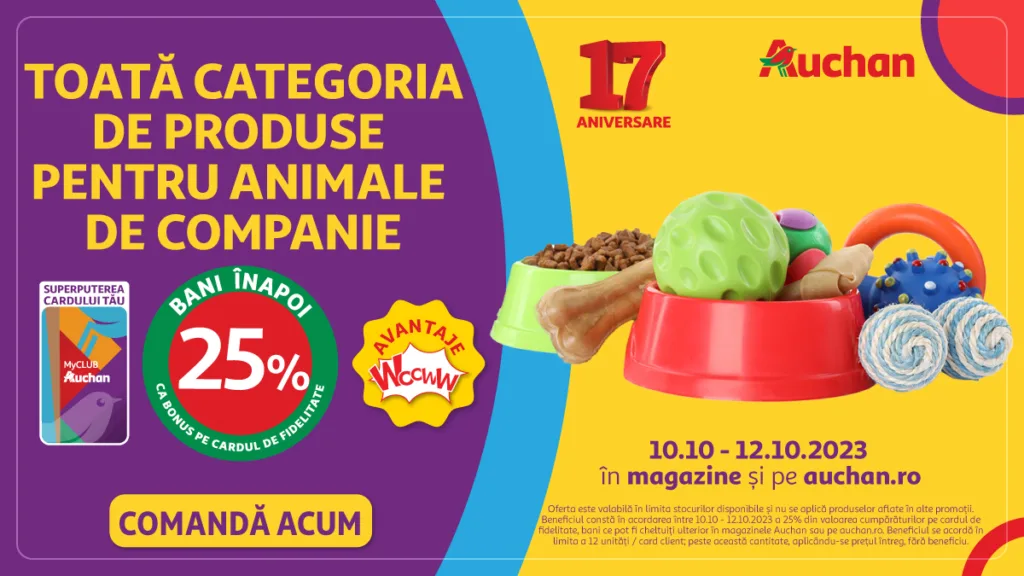 În plus, dacă ești membru MyCLUB Auchan, te bucuri de un beneficiu special. Ai 25% bani înapoi ca bonus pe cardul de fidelitate la toată categoría de produse pentru animale de companie.