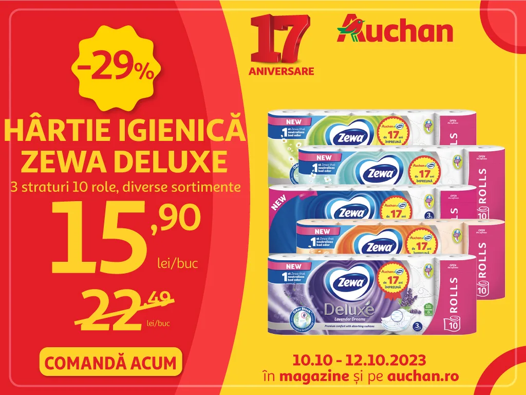 În perioada 10 – 12.10.2023, ai super preț la hârtie igienică Zewa Deluxe, 3 straturi, 10 role: 15,90 lei.