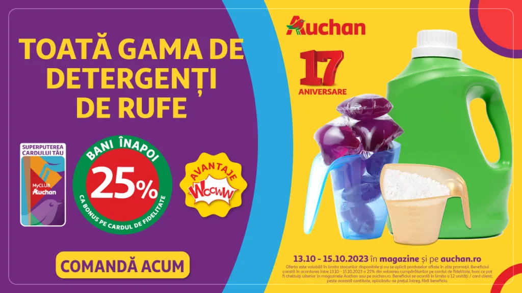 În plus, dacă ești membru MyCLUB Auchan, te bucuri de un beneficiu special: 25% bani înapoi ca bonus pe cardul de fidelitate la toată gama de detergenți de rufe.