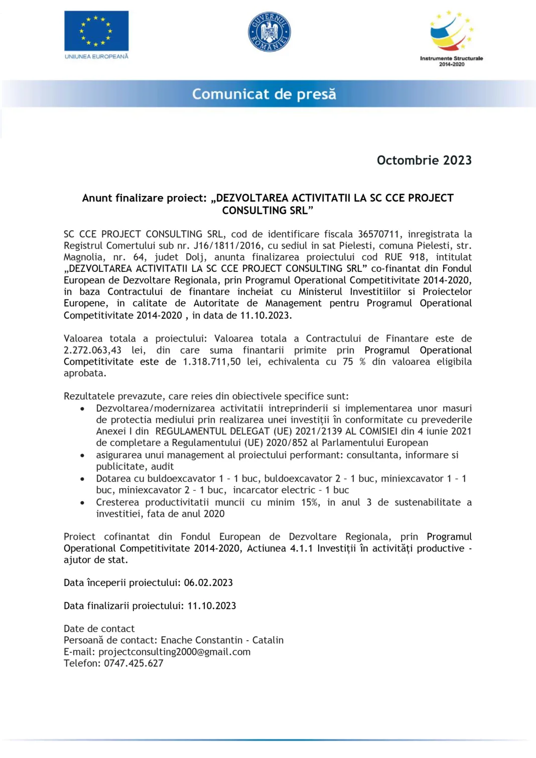 SC CCE PROJECT CONSULTING SRL, cod de identificare fiscala 36570711, inregistrata la Registrul Comertului sub nr. J16/1811/2016, cu sediul in sat Pielesti, comuna Pielesti, str. Magnolia, nr. 64, judet Dolj, anunta finalizarea proiectului cod RUE 918, intitulat „DEZVOLTAREA ACTIVITATII LA SC CCE PROJECT CONSULTING SRL” co-finantat din Fondul European de Dezvoltare Regionala, prin Programul Operational Competitivitate 2014-2020, in baza Contractului de finantare incheiat cu Ministerul Investitiilor si Proiectelor Europene, in calitate de Autoritate de Management pentru Programul Operational Competitivitate 2014-2020 , in data de 11.10.2023.