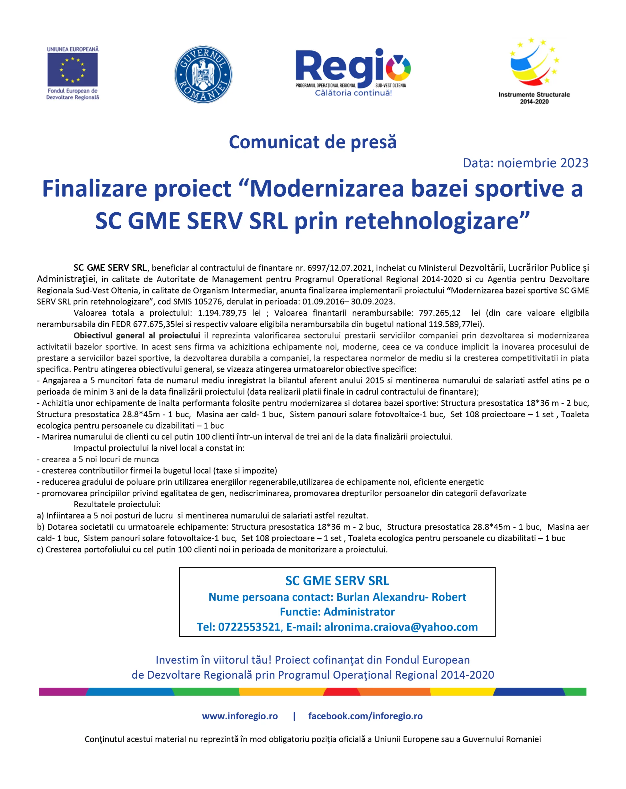 SC GME SERV SRL, beneficiar al contractului de finantare nr. 6997/12.07.2021, incheiat cu Ministerul Dezvoltării, Lucrărilor Publice şi Administraţiei, in calitate de Autoritate de Management pentru Programul Operational Regional 2014-2020 si cu Agentia pentru Dezvoltare Regionala Sud-Vest Oltenia, in calitate de Organism Intermediar, anunta finalizarea implementarii proiectului “Modernizarea bazei sportive SC GME SERV SRL prin retehnologizare”, cod SMIS 105276, derulat in perioada: 01.09.2016– 30.09.2023.