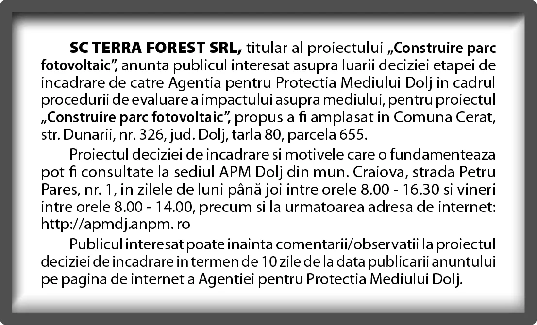publicul interesat asupra luarii deciziei etapei de incadrare de catre Agentia pentru Protectia Mediului Dolj in cadrul procedurii de evaluare a impactului asupra mediului, pentru proiectul „Construire parc fotovoltaic” propus a fi amplasat in Comuna Cerat, str. Dunarii, nr.326, jud. Dolj, tarla 80, parcela 655.