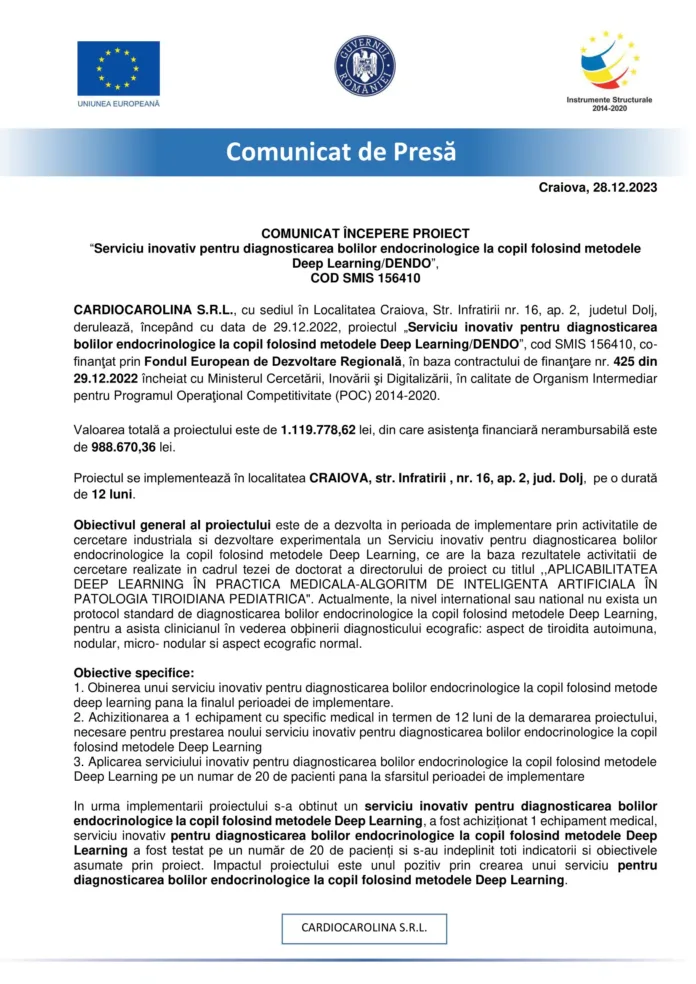 CARDIOCAROLINA S.R.L., cu sediul în Localitatea Craiova, Str. Infratirii nr. 16, ap. 2, judetul Dolj, derulează, începând cu data de 29.12.2022, proiectul „Serviciu inovativ pentru diagnosticarea bolilor endocrinologice la copil folosind metodele Deep Learning/DENDO”, cod SMIS 156410, co-finanţat prin Fondul European de Dezvoltare Regională, în baza contractului de finanţare nr. 425 din 29.12.2022 încheiat cu Ministerul Cercetării, Inovării şi Digitalizării, în calitate de Organism Intermediar pentru Programul Operaţional Competitivitate (POC) 2014-2020.