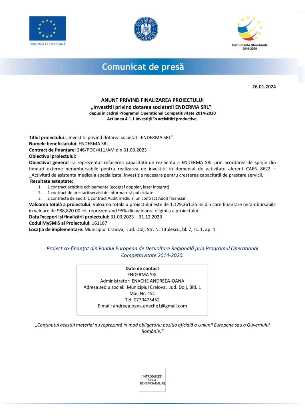 Anunț privind finalizarea proiectului „Investiții privind dotarea societății ENDERMA SRL”