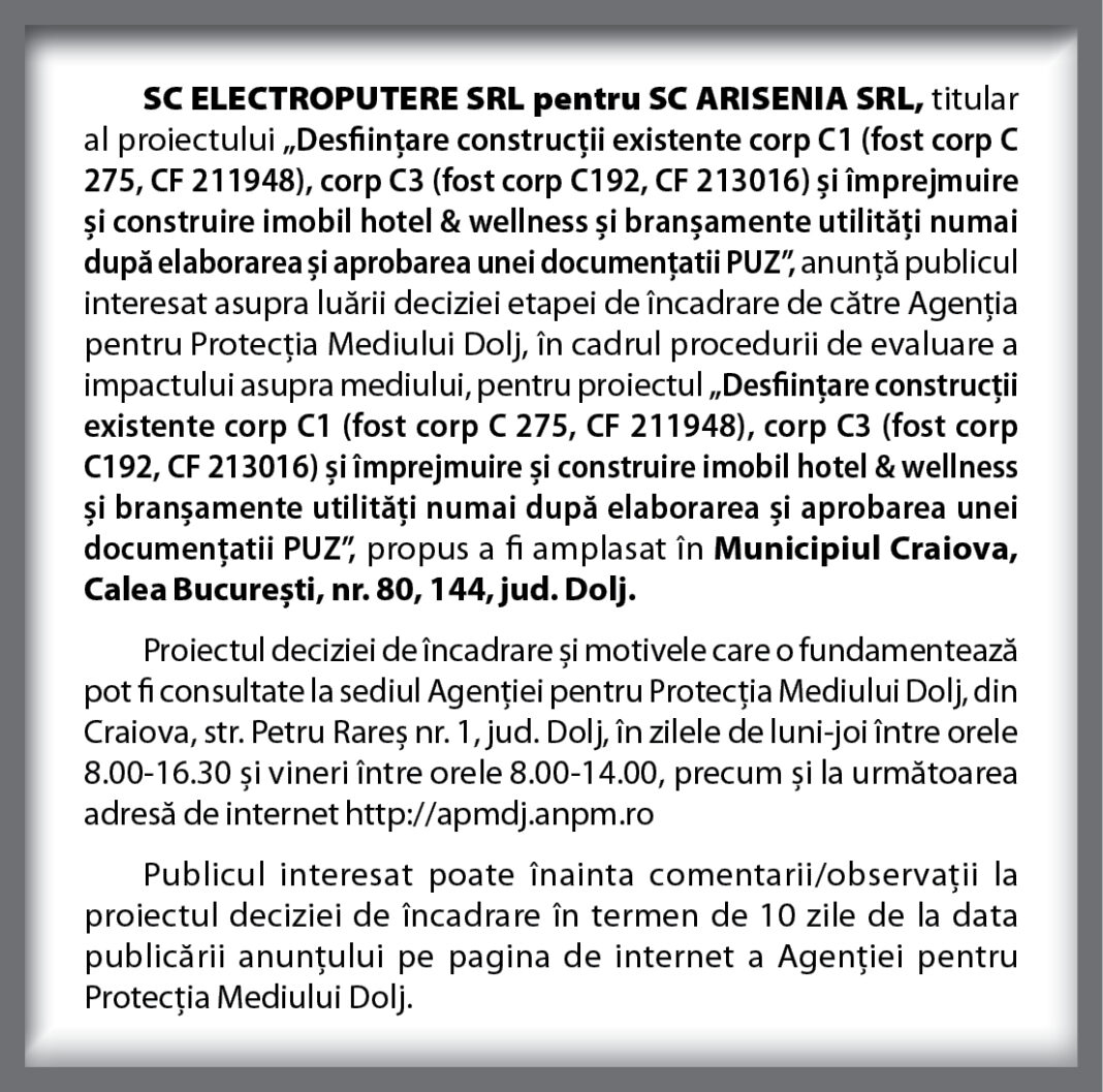 SC ELECTROPUTERE SRL pentru SC ARISENIA SRL, titular al proiectului „Desființare construcții existente corp C1(fost corp C 275, CF 211948), corp C3(fost corp C192, CF 213016) și împrejmuire și construire imobil hotel & wellness și branșamente utilități numai după elaborarea și aprobarea unei documențatii PUZ”, anunță publicul interesat asupra luării deciziei etapei de încadrare de către Agenția pentru Protecția Mediului Dolj, în cadrul procedurii de evaluare a impactului asupra mediului, pentru proiectul „Desființare construcții existente corp C1(fost corp C 275, CF 211948), corp C3(fost corp C192, CF 213016) și împrejmuire și construire imobil hotel & wellness și branșamente utilități numai după elaborarea și aprobarea unei documențatii PUZ”, propus a fi amplasat în Municipiul Craiova, Calea București, nr. 80, 144, jud. Dolj.