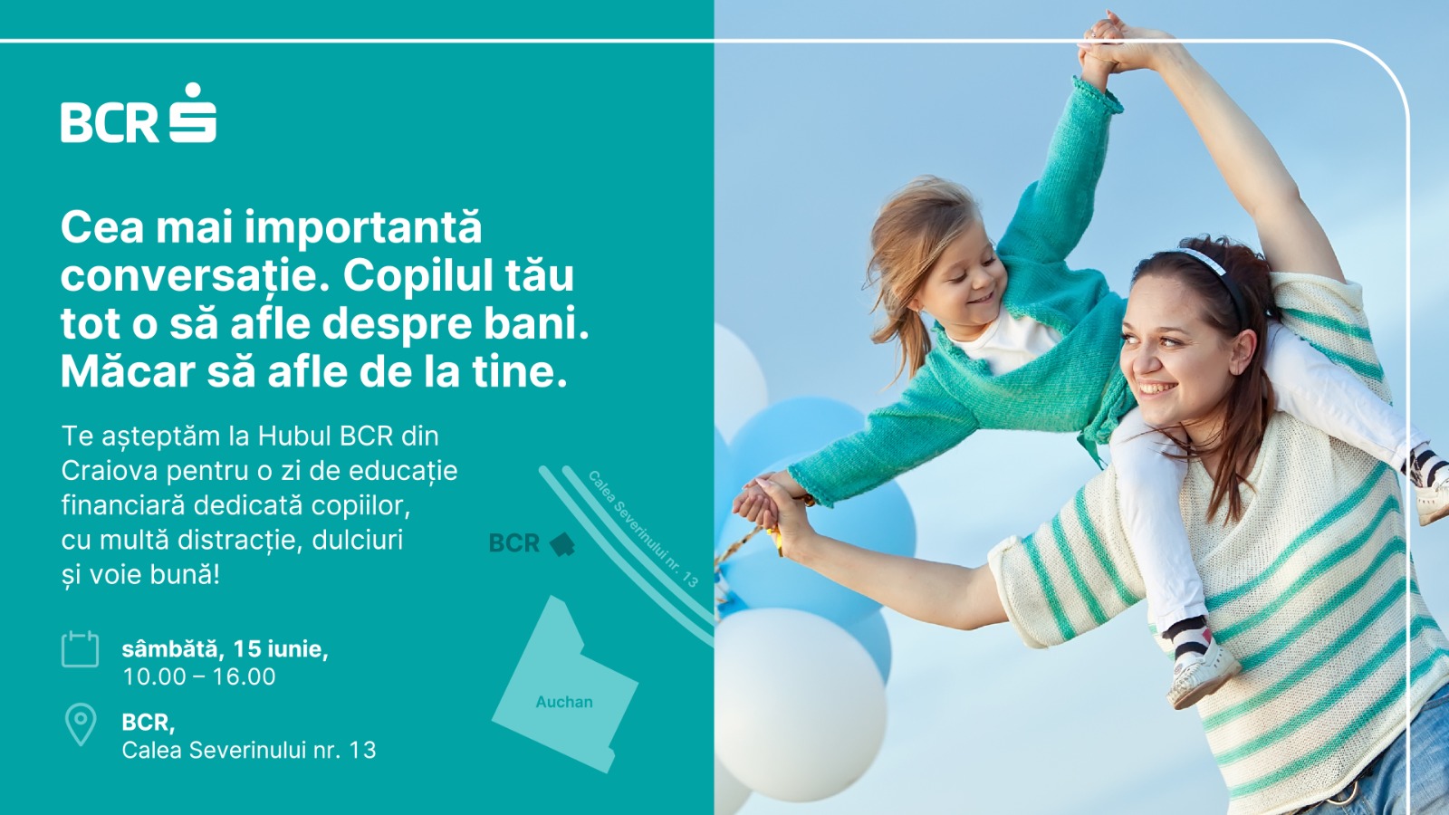 Astfel, pentru că educația financiară este primul pas pe care copiii îl pot face ca să devină adulții responsabili de mâine, hub-ul BCR din Calea Severinului 13 devine pe 15 iunie Banca Copiilor Responsabili și propune cea mai importantă conversație alături de părinți. Atât cei mici, cât și cei mari, sunt așteptați la o zi de educație financiară prin joacă și distracție, sâmbătă, între orele 10:00 și 16:00.