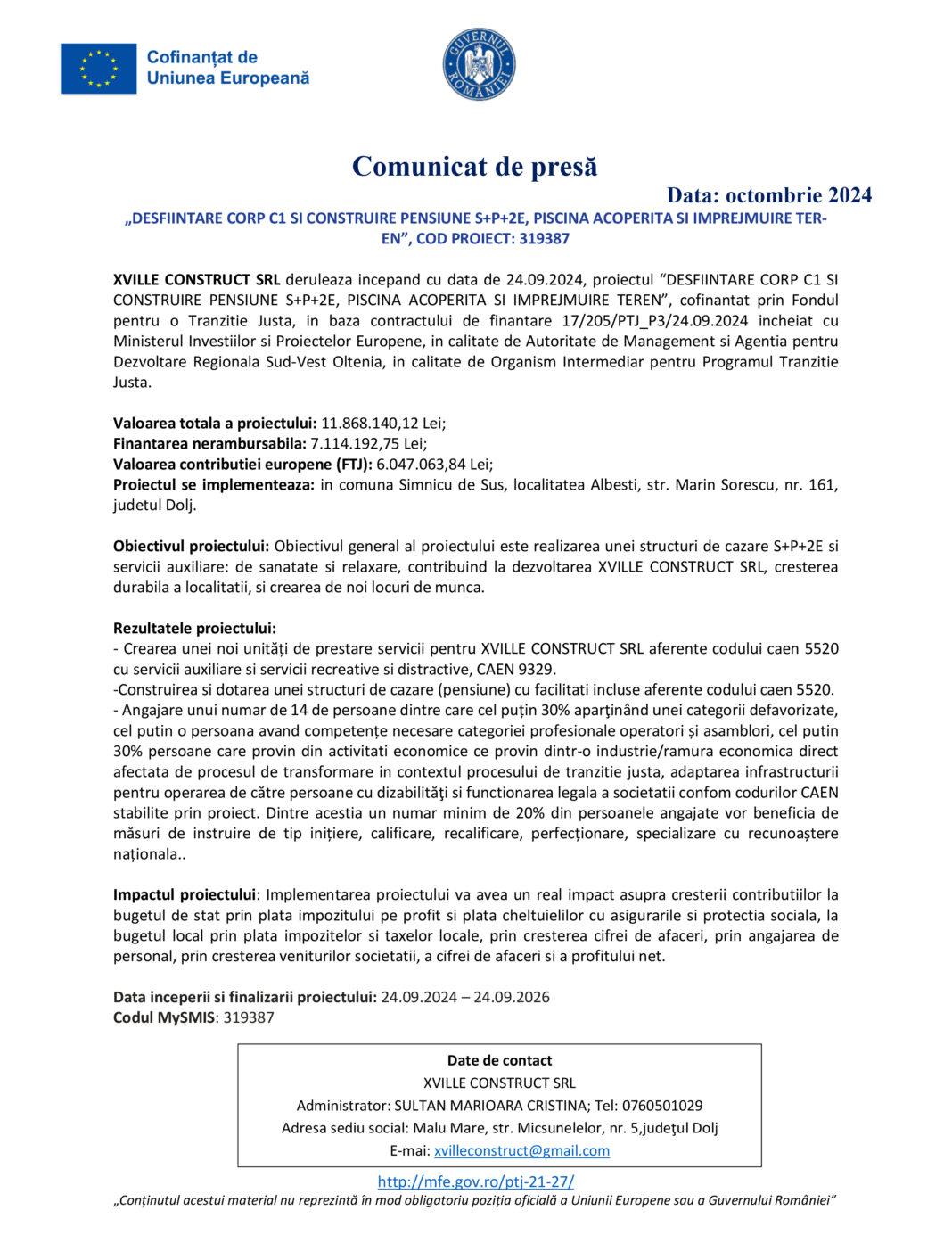XVILLE CONSTRUCT SRL deruleaza incepand cu data de 24.09.2024, proiectul “DESFIINTARE CORP C1 SI CONSTRUIRE PENSIUNE S+P+2E, PISCINA ACOPERITA SI IMPREJMUIRE TEREN”, cofinantat prin Fondul pentru o Tranzitie Justa, in baza contractului de finantare 17/205/PTJ_P3/24.09.2024 incheiat cu Ministerul Investiilor si Proiectelor Europene, in calitate de Autoritate de Management si Agentia pentru Dezvoltare Regionala Sud-Vest Oltenia, in calitate de Organism Intermediar pentru Programul Tranzitie Justa.
