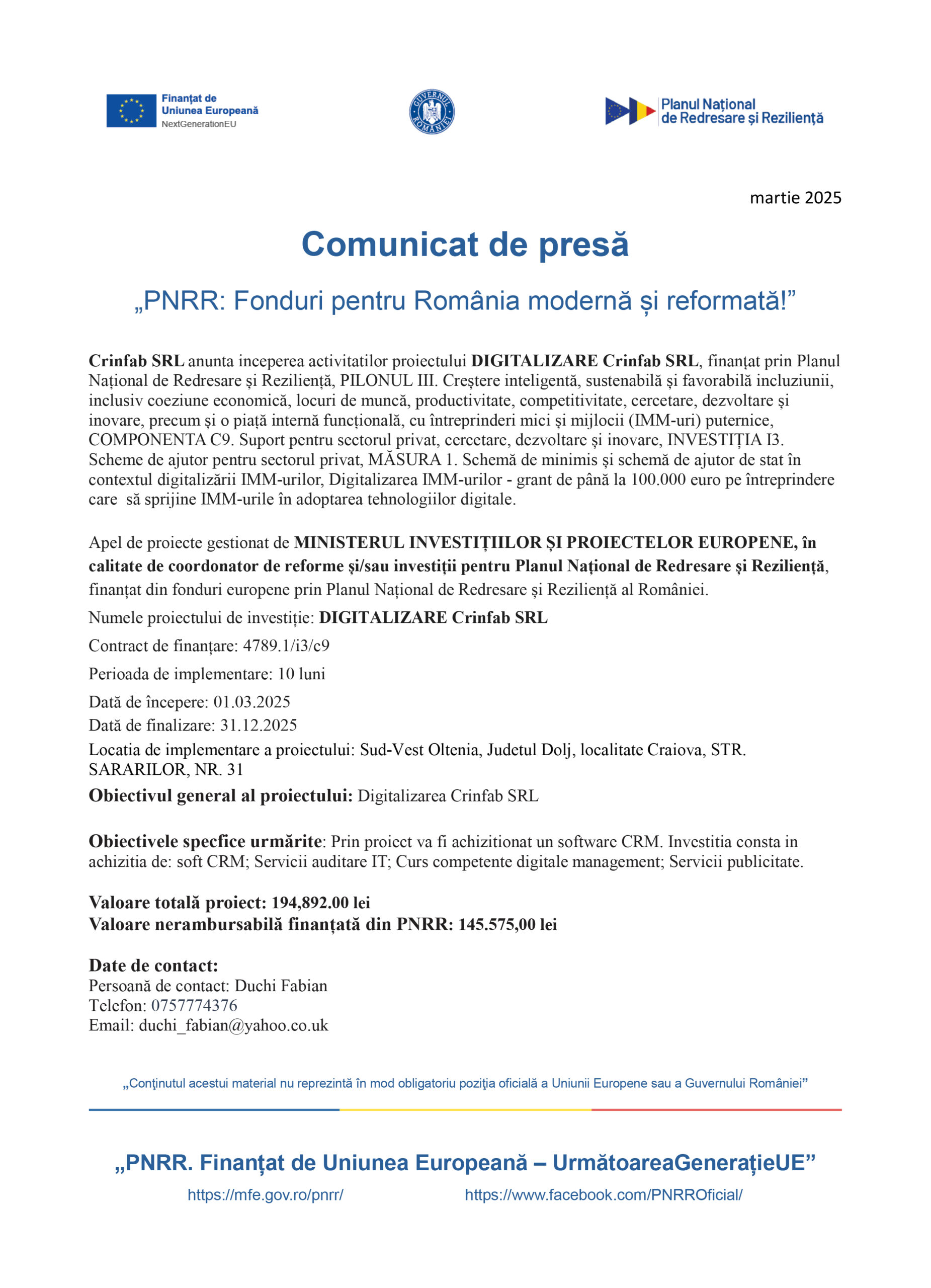 Crinfab SRL anunta inceperea activitatilor proiectului DIGITALIZARE Crinfab SRL, finanțat prin Planul Național de Redresare și Reziliență, PILONUL III. Creștere inteligentă, sustenabilă și favorabilă incluziunii, inclusiv coeziune economică, locuri de muncă, productivitate, competitivitate, cercetare, dezvoltare și inovare, precum și o piață internă funcțională, cu întreprinderi mici și mijlocii (IMM-uri) puternice, COMPONENTA C9. Suport pentru sectorul privat, cercetare, dezvoltare și inovare, INVESTIȚIA I3. Scheme de ajutor pentru sectorul privat, MĂSURA 1. Schemă de minimis și schemă de ajutor de stat în contextul digitalizării IMM-urilor, Digitalizarea IMM-urilor – grant de până la 100.000 euro pe întreprindere care să sprijine IMM-urile în adoptarea tehnologiilor digitale.