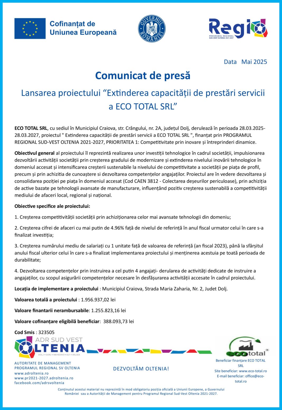ECO TOTAL SRL, cu sediul în Municipiul Craiova, str. Crângului, nr. 2A, județul Dolj, derulează în perioada 28.03.2025-