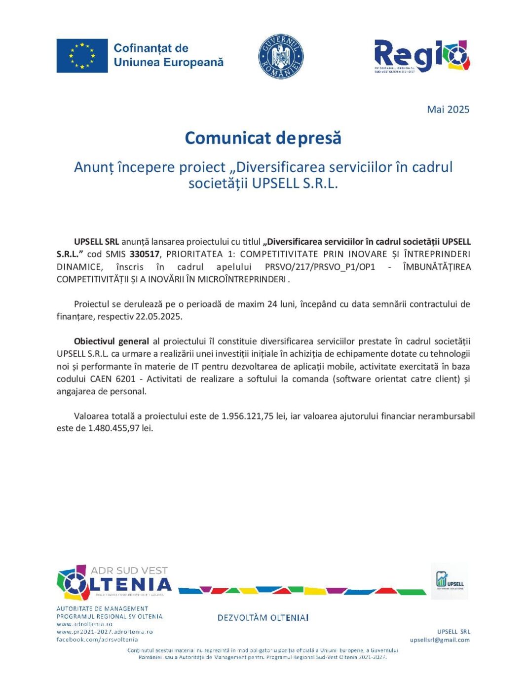 UPSELL SRL anunță lansarea proiectului cu titlul „Diversificarea serviciilor în cadrul societății UPSELL