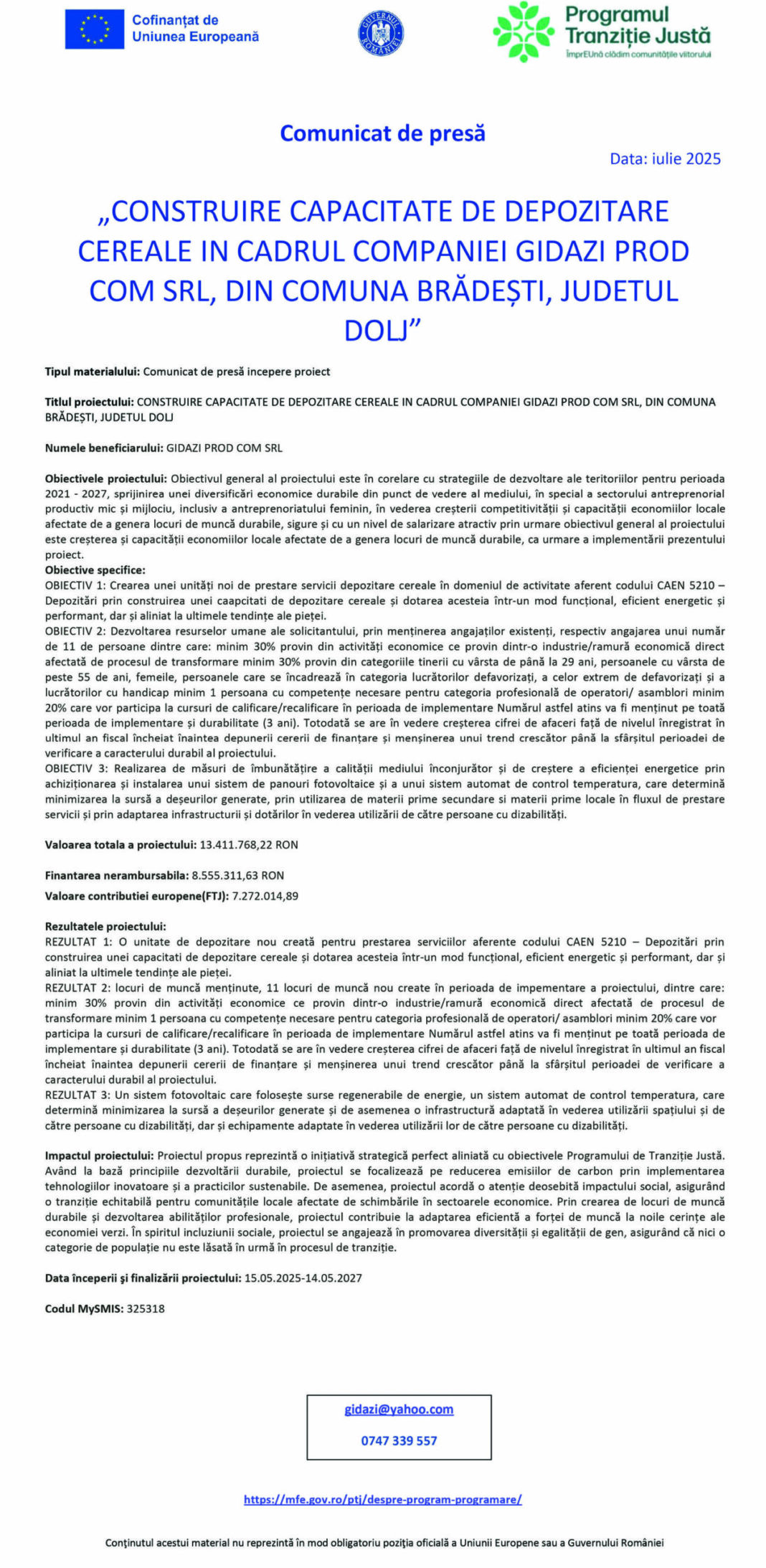 Construire capacitate de depozitare cereale în cadrul companiei Gidazi Prod Com SRL, din Comuna Brădeşti