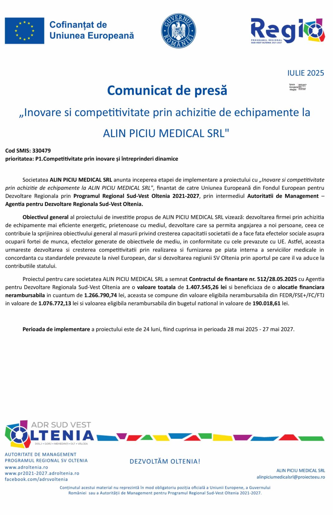 Proiectul pentru care societatea ALIN PICIU MEDICAL SRL a semnat Contractul de finanțare nr. 512/28.05.2025 cu Agenția pentru Dezvoltare Regională Sud-Vest Oltenia are o valoare toatală de 1.407.545,26 lei și beneficiază de o alocație financiară nerambursabilă în cuantum de 1.266.790,74 lei, această se compune din valoare eligibilă nerambursabilă din FEDR/FSE+/FC/FTJ în valoare de 1.076.772,13 lei și valoarea eligibilă nerambursabilă din bugetul național în valoare de 190.018,61 lei.