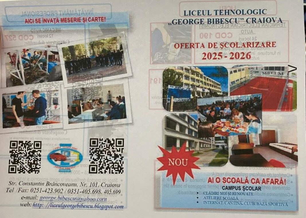 Liceul Tehnologic George Bibescu a publicat, oficial, oferta educaţională pentru anul educaţional 2025-2026. Unitatea de învăţământ oferă şi mai multe facilități pentru elevi, de la condiții de cazare moderne și campus, la burse tehnologice sau chiar permise de conducere.