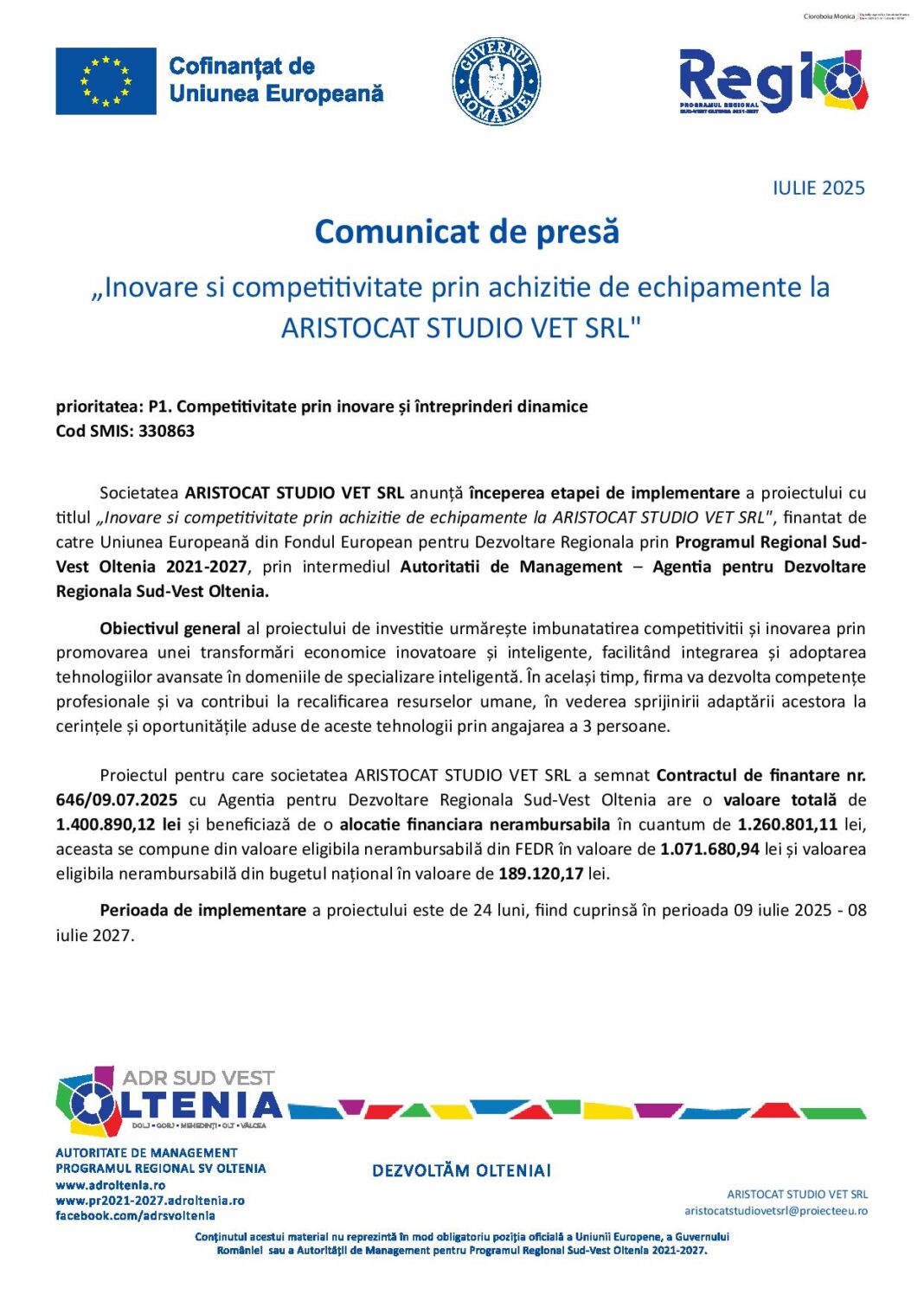Societatea ARISTOCAT STUDIO VET SRL anunță începerea etapei de implementare a proiectului cu titlul „Inovare si competitivitate prin achizitie de echipamente la ARISTOCAT STUDIO VET SRL”, finantat de catre Uniunea Europeană din Fondul European pentru Dezvoltare Regionala prin Programul Regional SudVest Oltenia 2021-2027, prin intermediul Autoritatii de Management – Agentia pentru Dezvoltare Regionala Sud-Vest Oltenia.