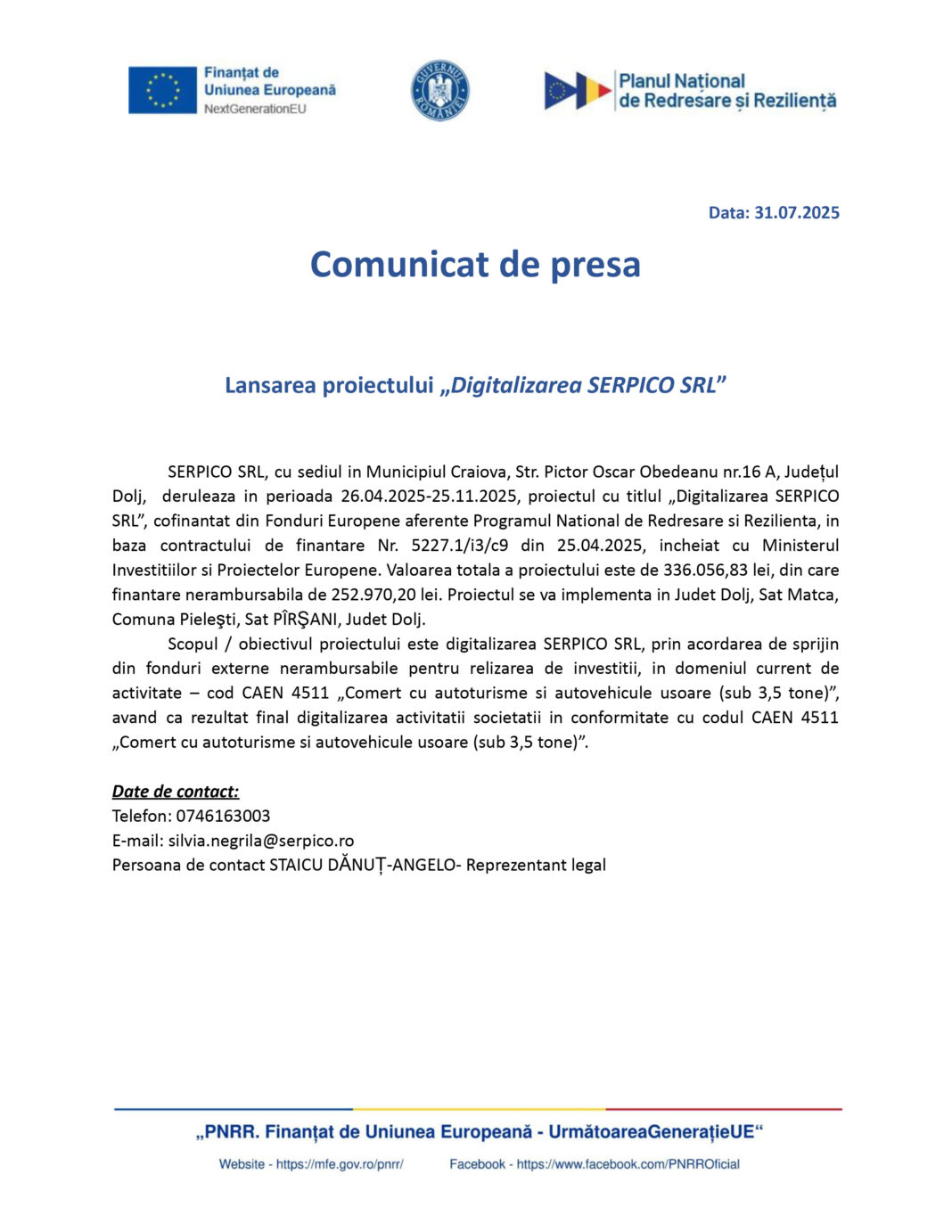 SERPICO SRL, cu sediul în Municipiul Craiova, Str. Pictor Oscar Obedeanu nr.16 A, Județul Dolj, derulează în perioada 26.04.2025-25.11.2025, proiectul cu titlul „Digitalizarea SERPICO SRL”, cofinantat din Fonduri Europene aferente Programul Naţional de Redresare şi Rezilienţă, în baza contractului de finanţare Nr. 5227.1/i3/c9 din 25.04.2025, încheiat cu Ministerul Investiţiilor si Proiectelor Europene. Valoarea totala a proiectului este de 336.056,83 lei, din care finanţare nerambursabila de 252.970,20 lei. Proiectul se va implementa in Judeţ Dolj, Sat Matca, Comuna Pieleşti, Sat PÎRŞANI, Judet Dolj.