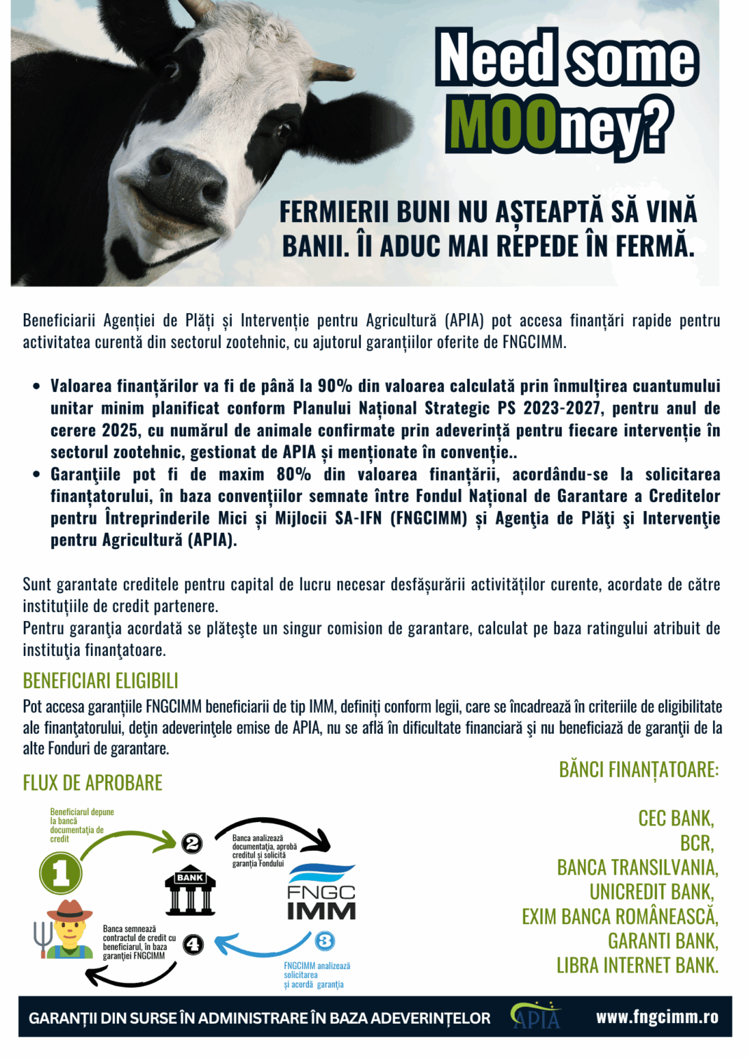 Colaborarea dintre APIA, FNGCIMM și instituțiile bancare, asigură un cadru clar și transparent, facilitând accesul fermierilor la finanțare în condiții avantajoase și sprijinind dezvoltarea sustenabilă a sectorului zootehnic.