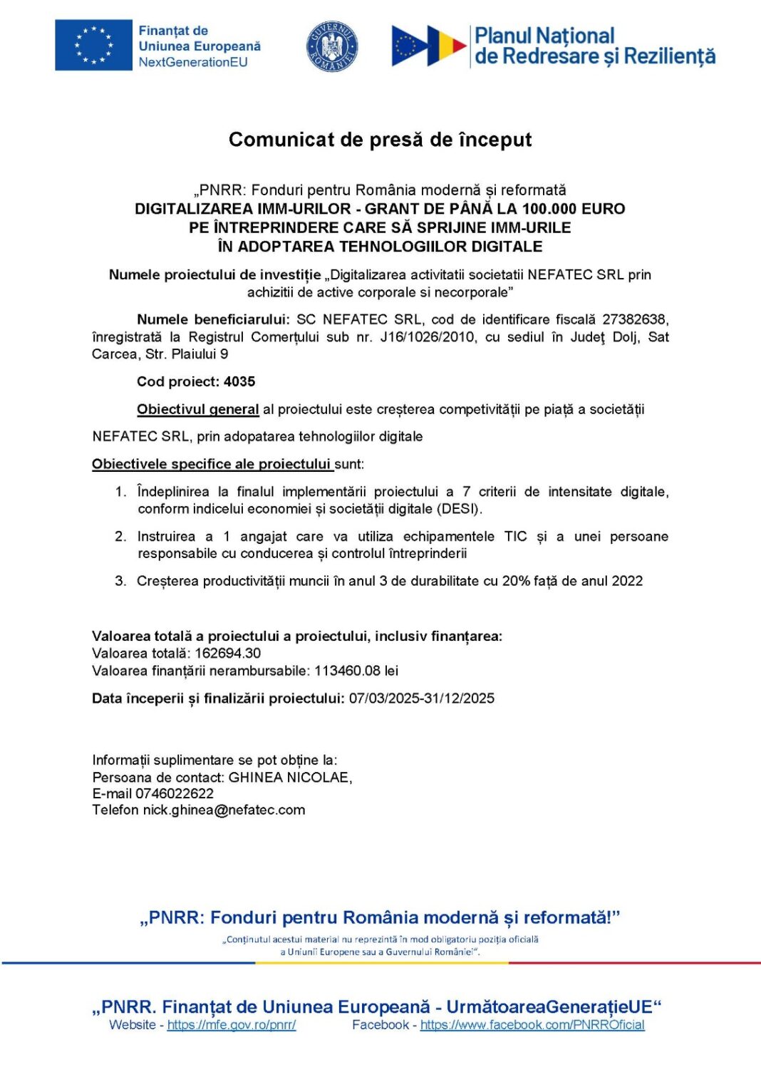 Numele beneficiarului: SC NEFATEC SRL, cod de identificare fiscală 27382638, înregistrată la Registrul Comerțului sub nr. J16/1026/2010, cu sediul în Judeţ Dolj, Sat Carcea, Str. Plaiului 9